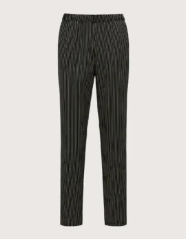 Unisex chef/cook pants “Sirio” in black pinstripe. Features two side pockets and one back pocket, elastic waistband with drawstring closure. Fabric: 35% cotton, 65% polyester blend. Washable up to 60°C. Comfort fit. Sizes available from XS to XXXL. Made by Toma Youniform, 100% Made in Italy. Professional clothing ideal for kitchens, pastry shops, gastronomy, and food laboratories. Also available in blue pinstripe