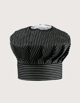 “Palmas” chef hat in 100% cotton, 190 g/m², pinstripe fabric available in black and blue. Machine washable up to 60°C. Ideal for restaurants, pubs, delis, and food laboratories.