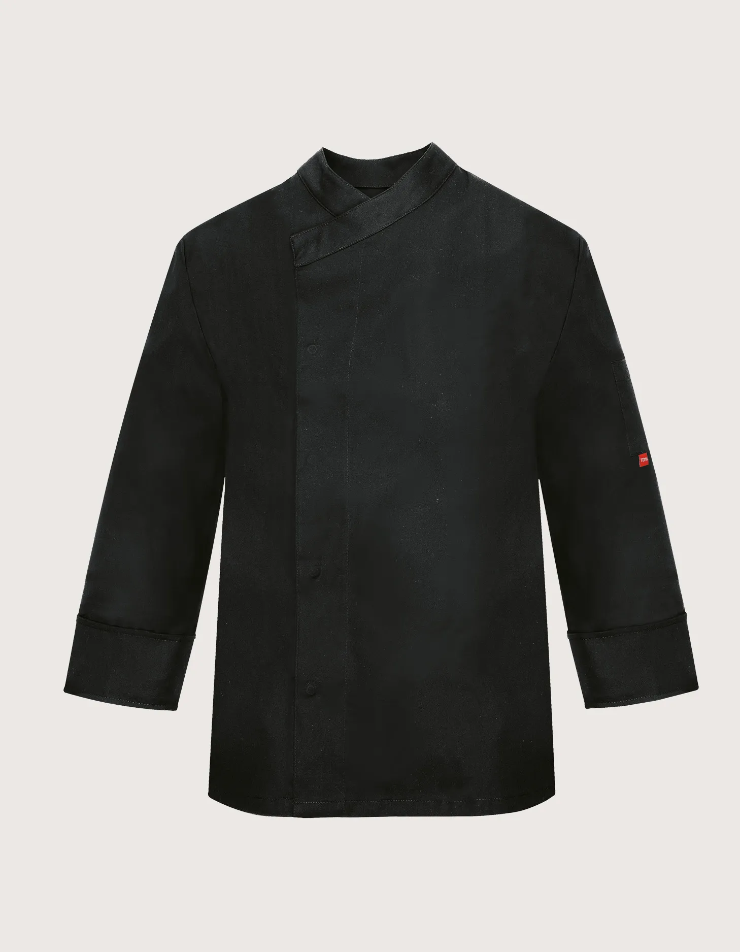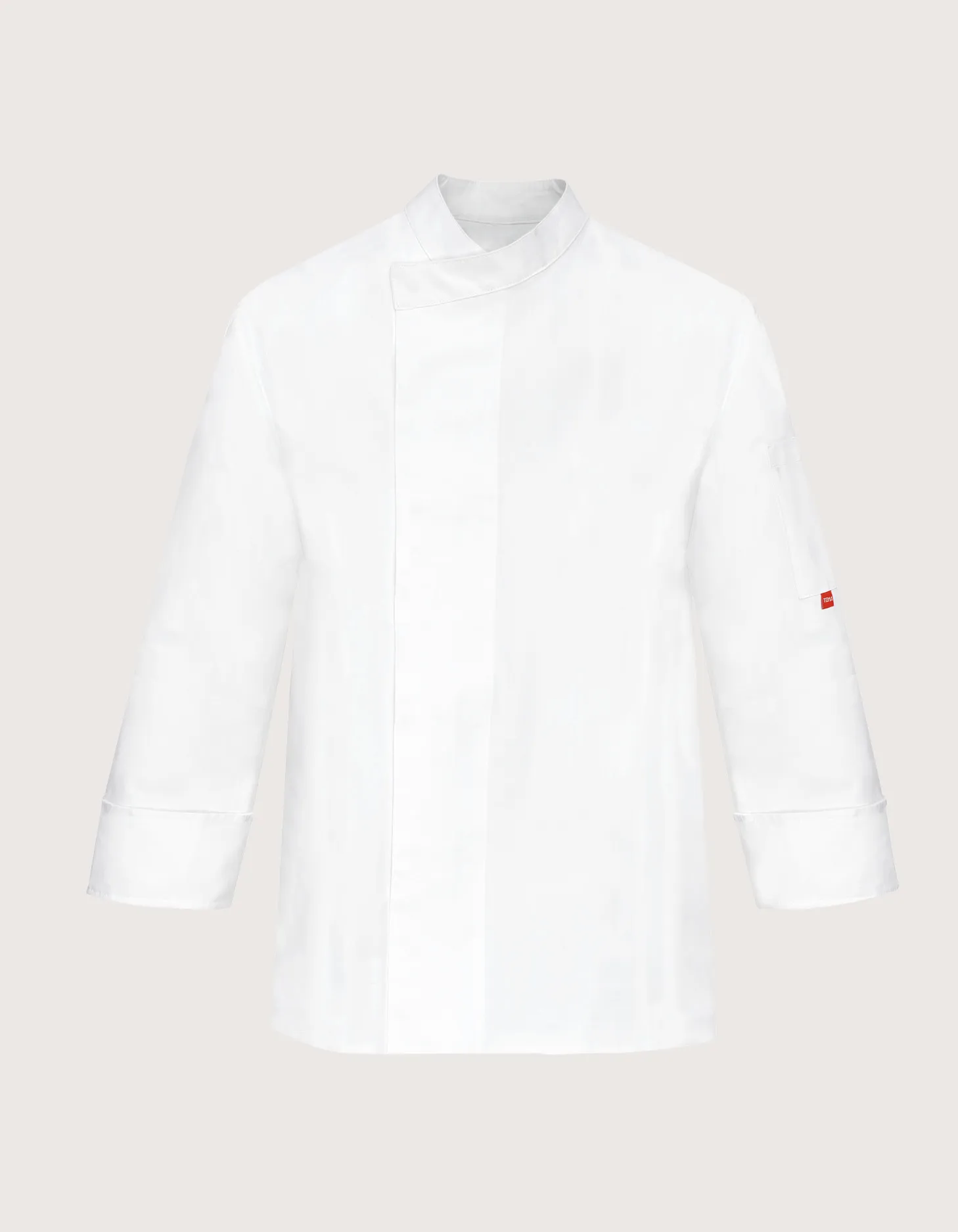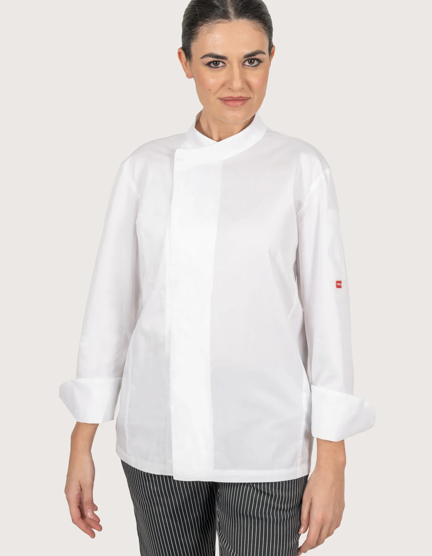 Unisex chef jackets, long sleeves, very light and comfortable. Available colors: white and black. Features: 100% cotton fabric; ventilation mesh on the back; small pocket on the left sleeve. Closure: side fastening with covered press studs, not in contact with the skin. Available sizes: from XS to XXXL. Washable up to 60°C. 100% Made in Italy. Suitable as a professional uniform for kitchens, pastry shops, gastronomy, and food laboratories.