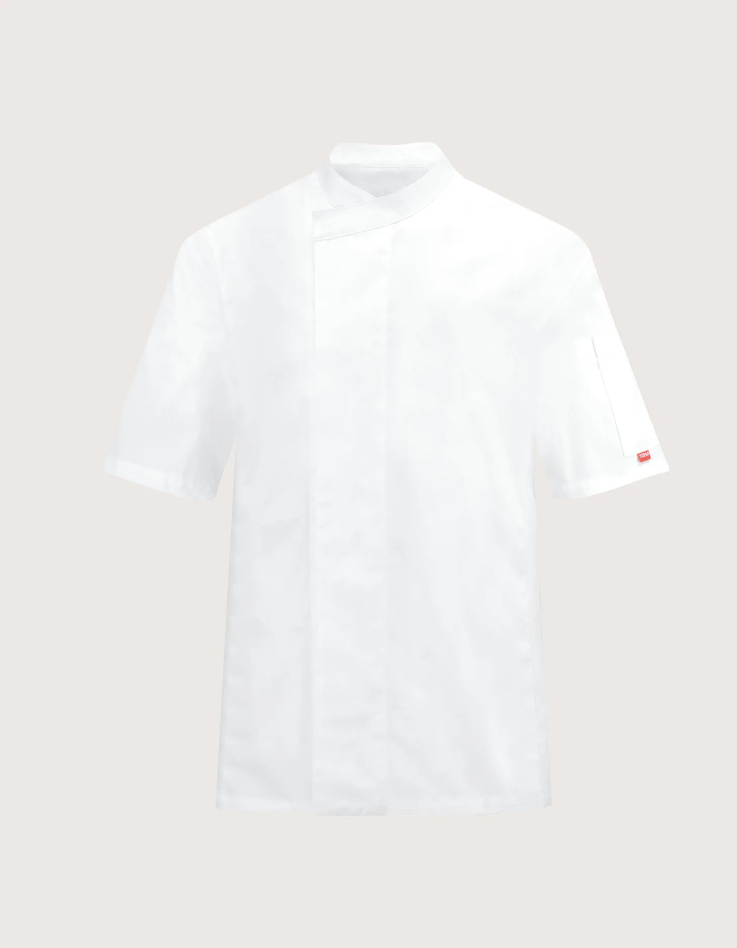 Unisex white short sleeve chef jacket “100 Grams”, very light and comfortable. Features: 100% cotton fabric; ventilation mesh on the back; small pocket on the left sleeve. Closure: side fastening with covered press studs, not in contact with the skin. Available sizes: from XS to XXXL. Washable up to 60°C. 100% Made in Italy. Suitable as a professional uniform for kitchens, pastry shops, gastronomy, and food laboratories. Also available in black