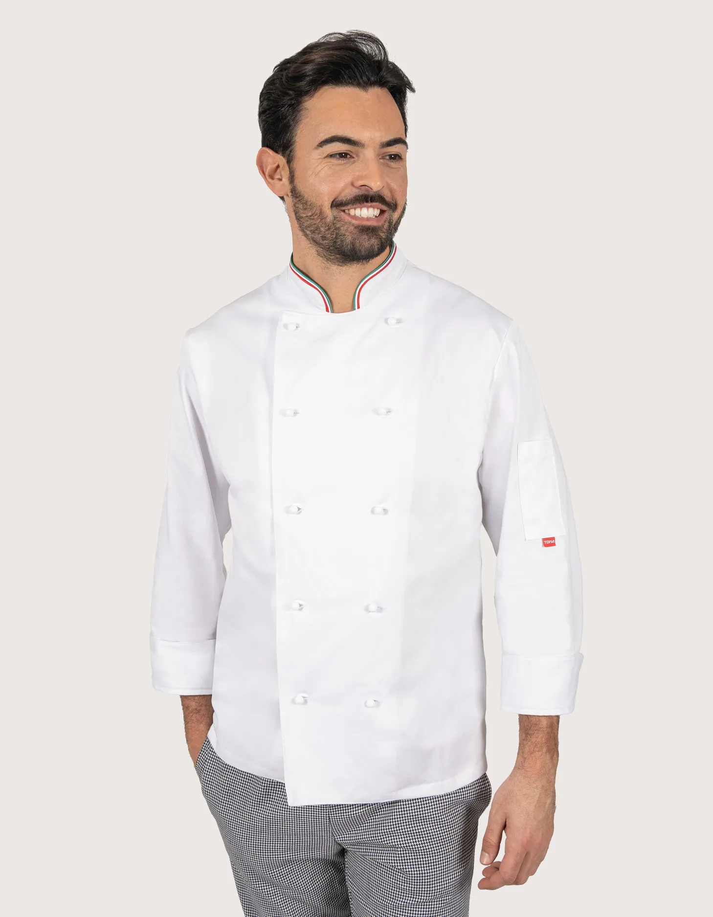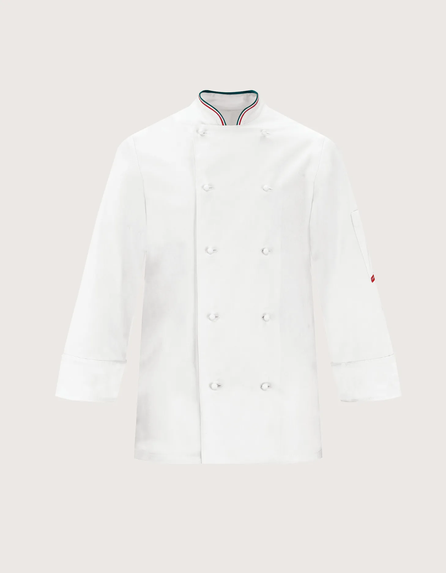 Unisex chef/cook jacket, long sleeves. Available color: white with tricolor collar. Features: 100% cotton fabric, pocket on the left sleeve. Closure: central with 10 removable white buttons. Available sizes: XS to XXXL. Washing guaranteed up to 60°C. 100% Made in Italy. Suitable as a uniform for kitchens, pastry shops, gastronomy, and food laboratories.