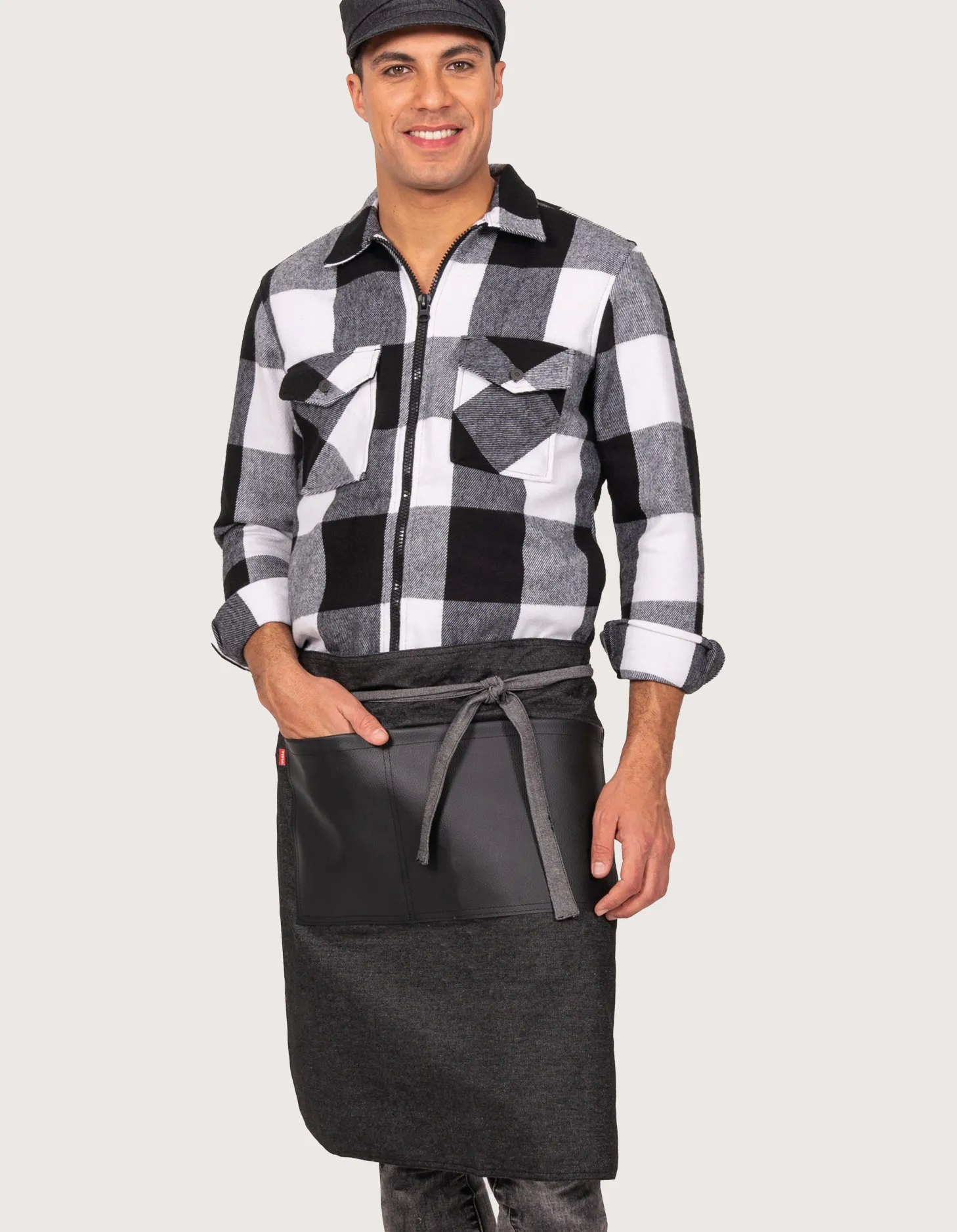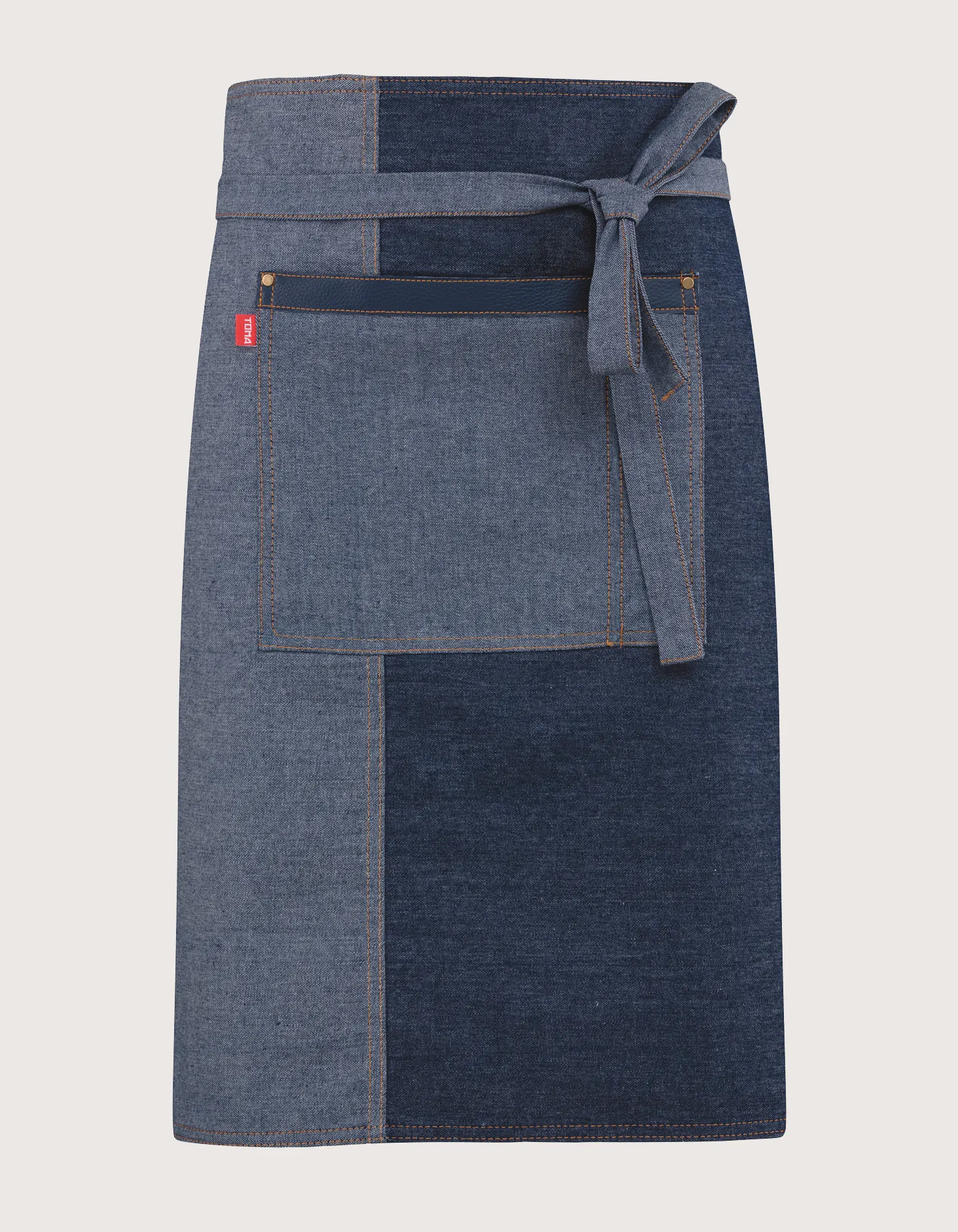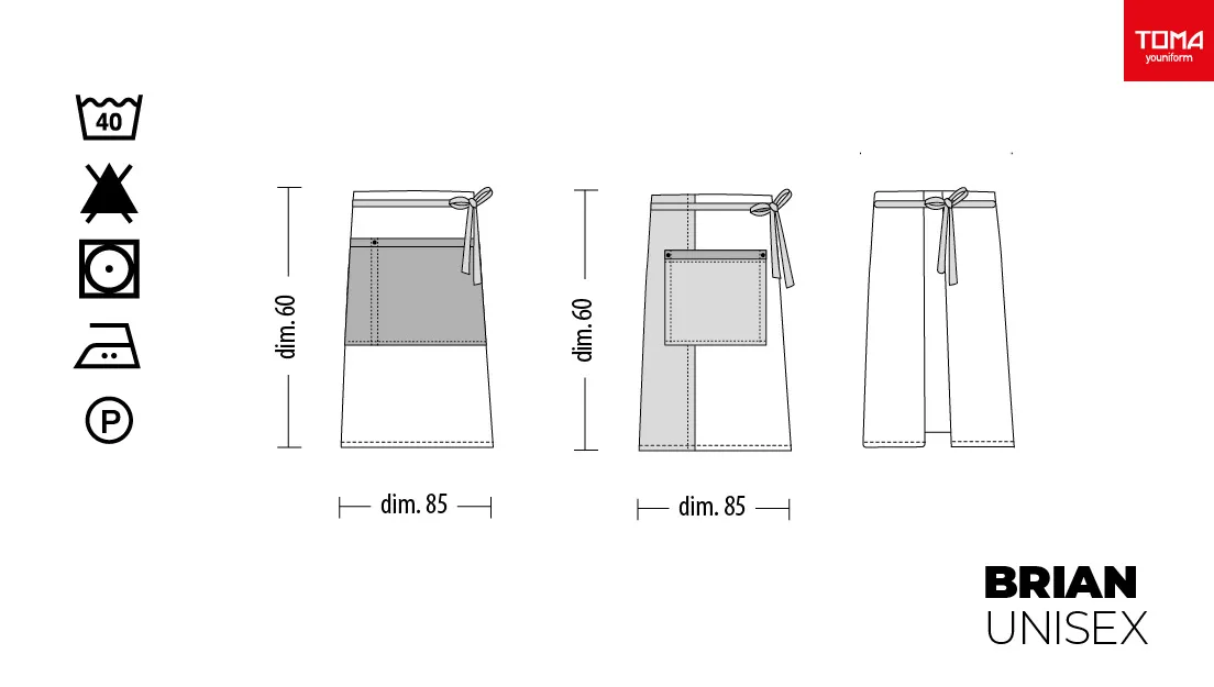 Unisex denim apron with blue eco-leather inserts “Brian”, ideal for restaurant and bar staff. Fabric: 100% cotton denim – Eco-leather. Features: no bib, rear and/or front tie closure, large central pocket. Dimensions: 85 x 60 cm (width x height). Machine washable up to 40°C. 100% Made in Italy. Also available in black denim.