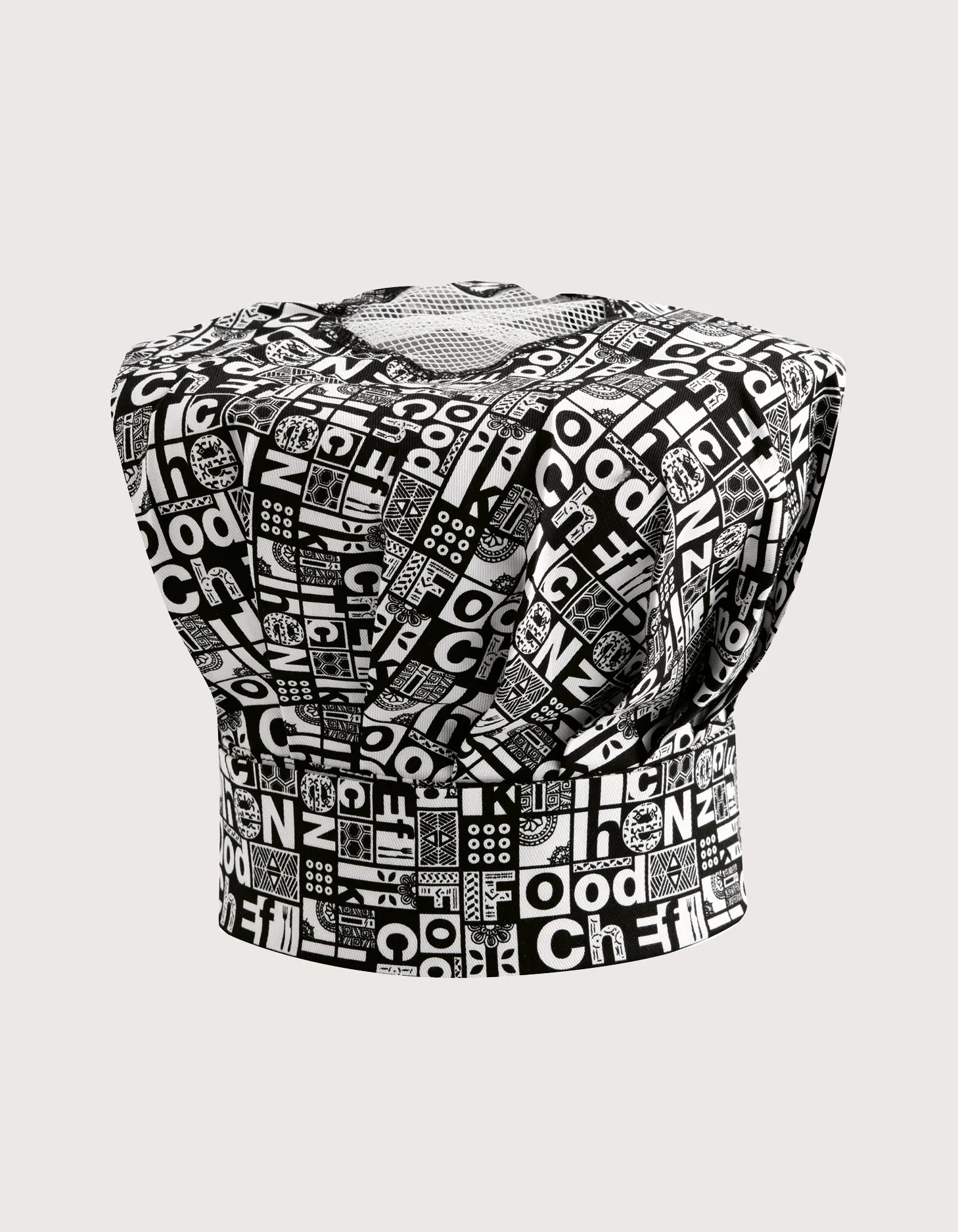 “Palmas” chef hat in 100% cotton, 190 g/m², pattern Black & White. Machine washable up to 60°C. Ideal for restaurants, pubs, delis, and food laboratories.