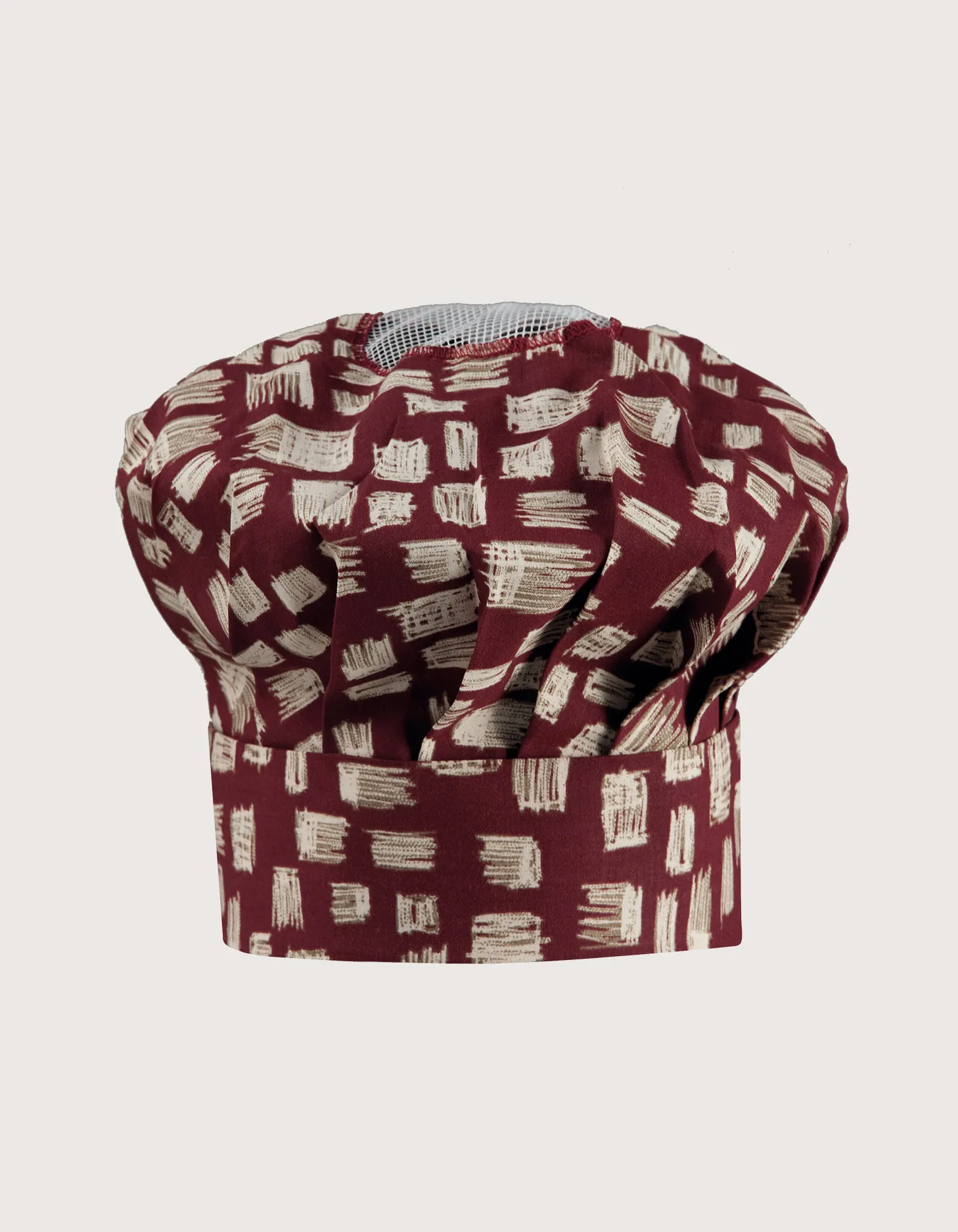 “Palmas” chef hat in 100% cotton, 190 g/m², pattern Wine Red Pattern. Machine washable up to 60°C. Ideal for restaurants, pubs, delis, and food laboratories.