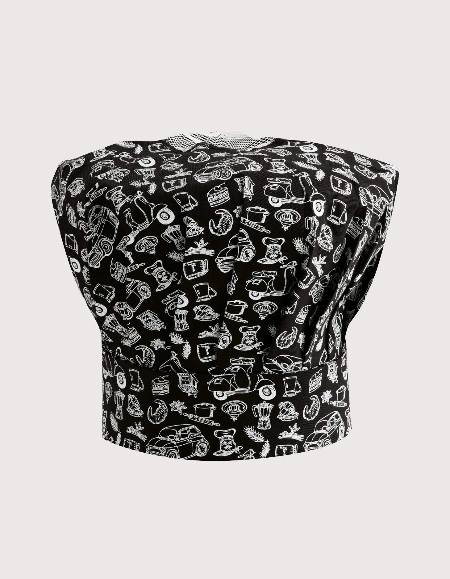 “Palmas” chef hat in 100% cotton, 190 g/m², pattern Italy. Machine washable up to 60°C. Ideal for restaurants, pubs, delis, and food laboratories.