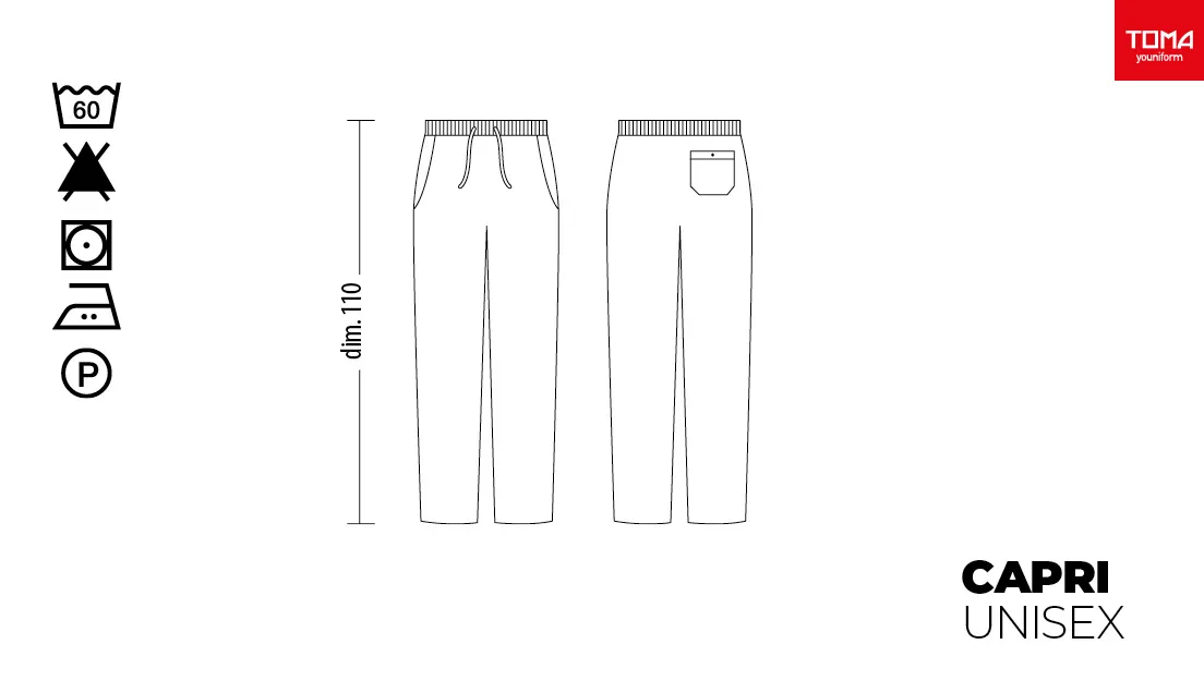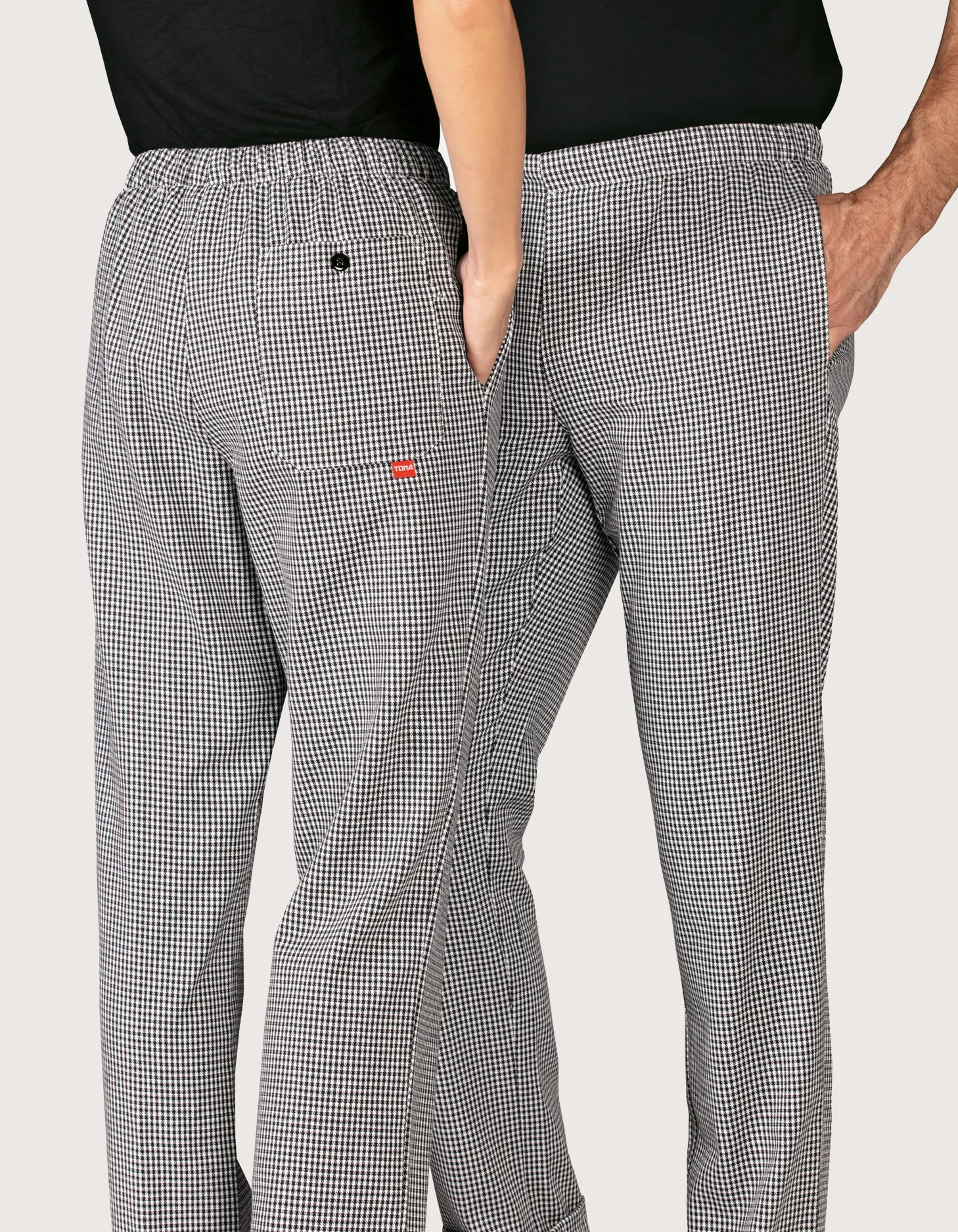 Unisex chef/cook pants in classic “Pied de Poule” pattern, featuring elastic waistband with drawstring closure. Features: 100% cotton fabric; three pockets including two side pockets and one back pocket. Comfort fit. Sizes available from XS to XXXL. Machine washable up to 60°C. 100% Made in Italy. Ideal as part of the uniform for kitchens, pastry shops, gastronomy, and food laboratories.