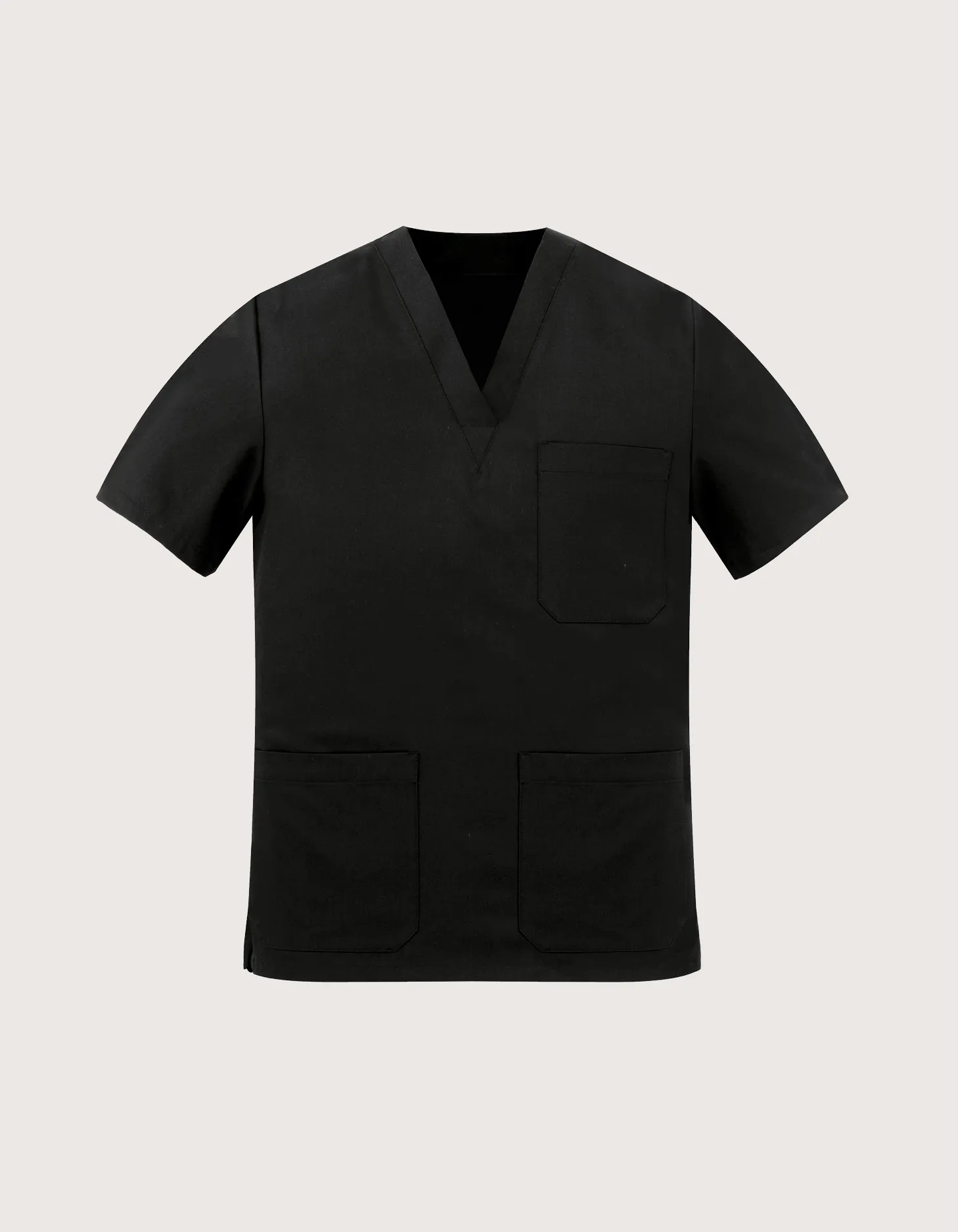 Unisex short-sleeve scrub top “Zeus” available in solid colors: classic white or black, as well as red and yellow. V-neck design with three pockets: two side and one chest pocket. Made of 65% polyester – 35% cotton blend fabric (195 g/m²), straight cut with small side slits. Available in sizes XS to XXXL. Washable up to 70°C, both in white and colored versions. Particularly suitable for the healthcare, beauty, and pharmaceutical sectors (healthcare operators, doctors, nurses, beauticians). The “Zeus” scrub top can be paired with Robin trousers in matching colors. Professional clothing by Toma Youniform, 100% Made in Italy.