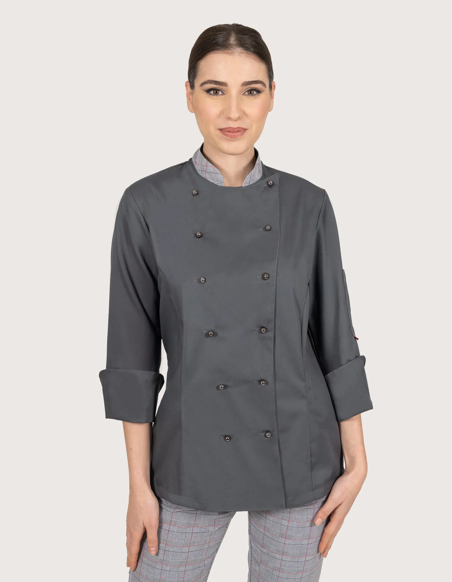 White women’s chef jacket, long sleeve with a Prince of Wales collar. Features: 65% polyester – 35% cotton blend; pocket on the left sleeve. Closure: central with 10 removable white buttons. Sizes available: XS to XXL. Washable up to 70°C. 100% Made in Italy. Suitable as a uniform for kitchens, pastry shops, gastronomy, and food laboratories. Other colors available: black, grey.