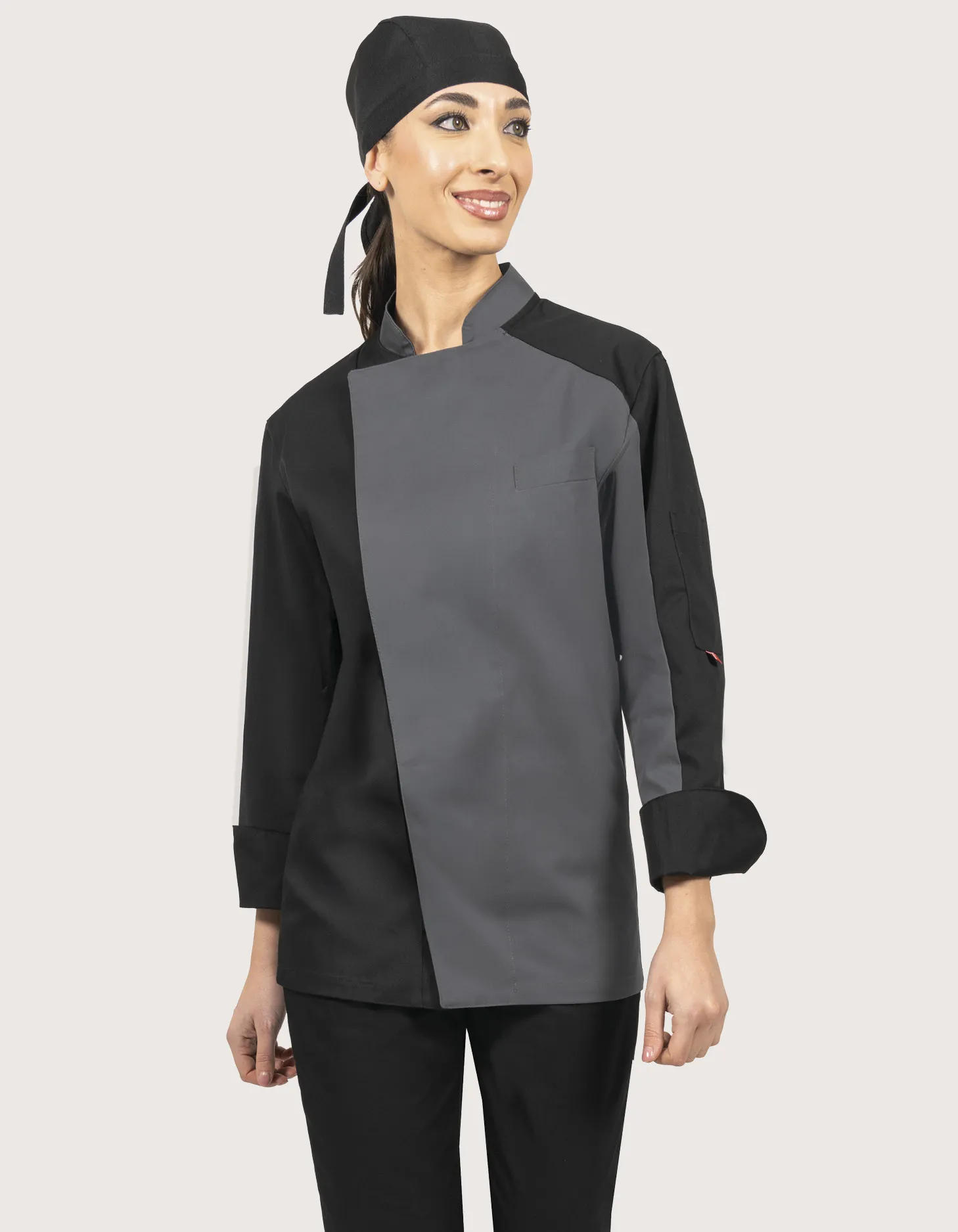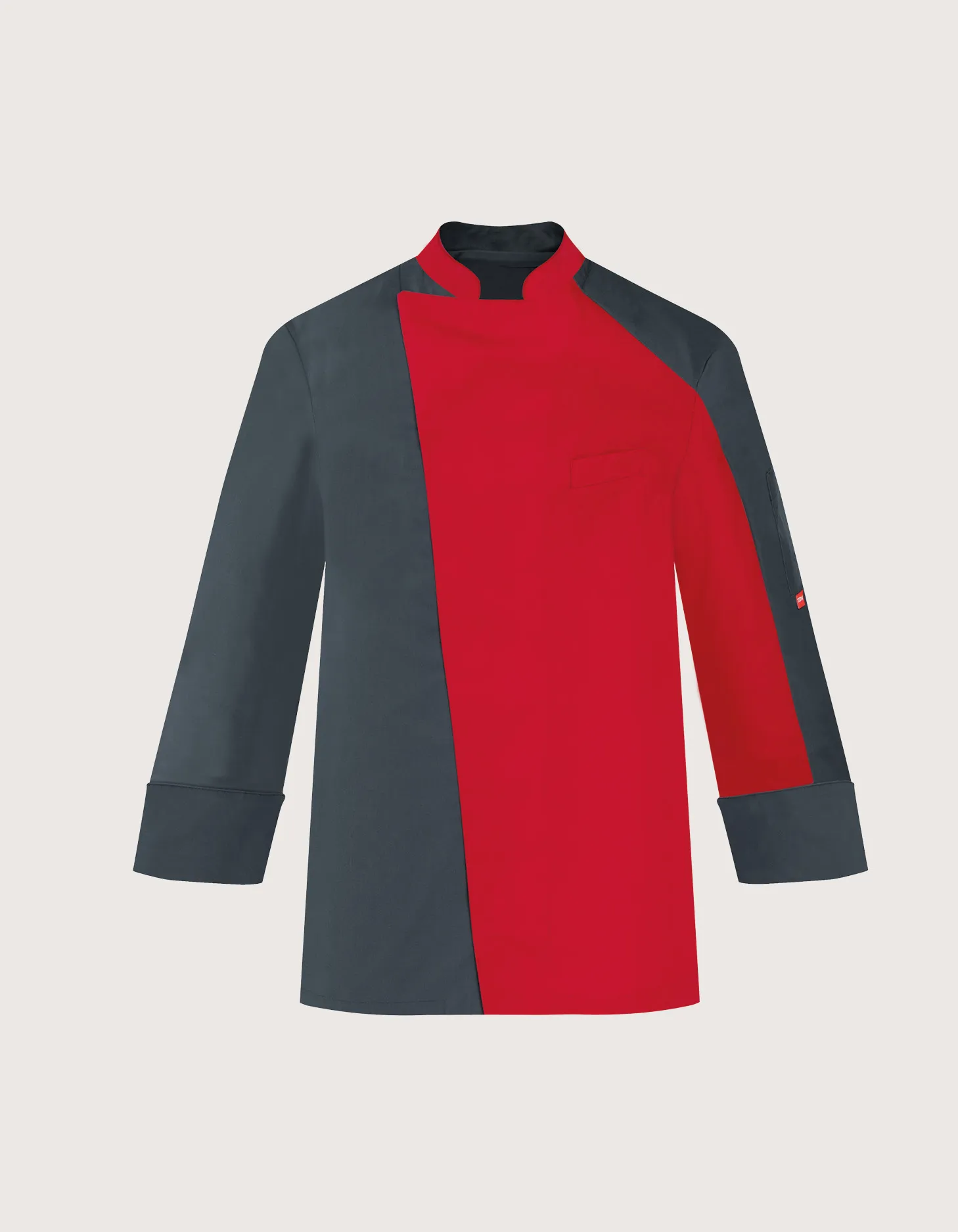 Unisex Everest chef jacket with embroidery, long sleeves. Available colors: grey-red and black-grey. Features: fabric blend: 65% polyester / 35% cotton; chest pocket and left sleeve pocket. Closure: side snap buttons covered – not in contact with the skin. Available sizes: from XS to XXXL. Washable up to 70°C. 100% Made in Italy. Suitable as a professional uniform for kitchens, pastry shops, gastronomy, and food laboratories.