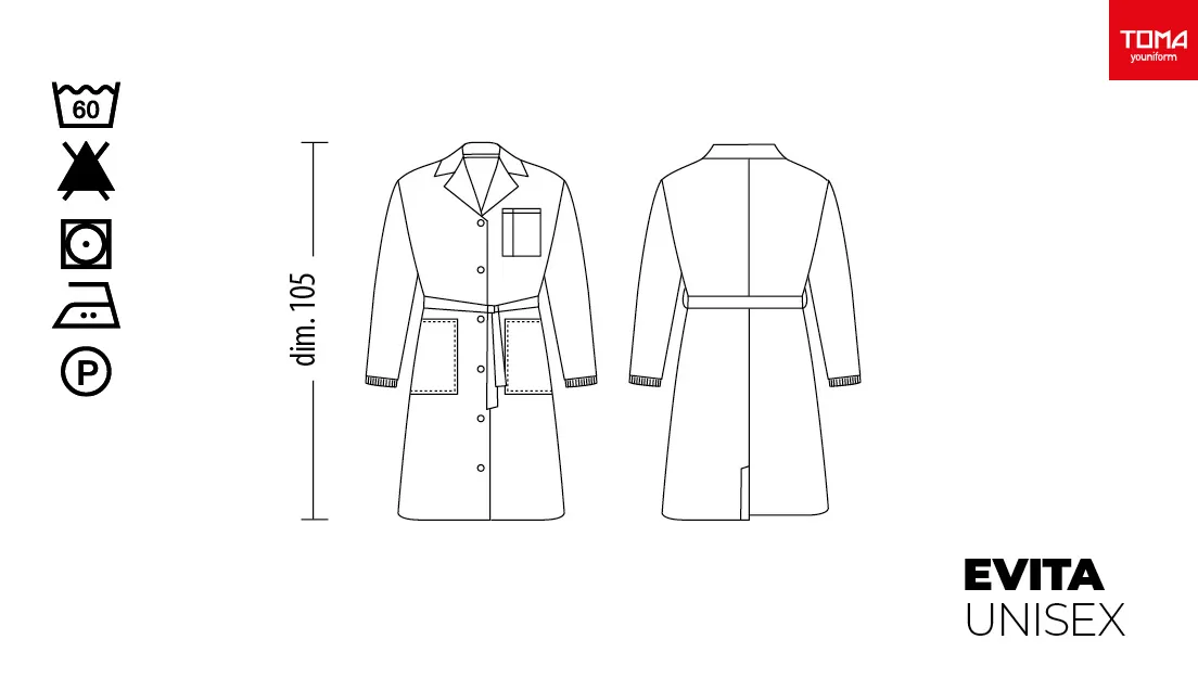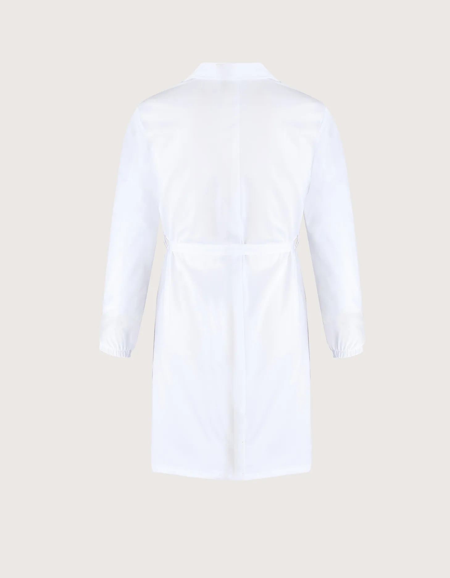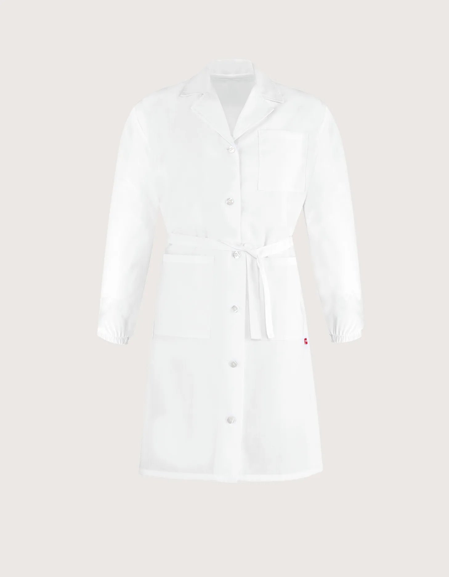 Women’s lab coat with waist belt; elastic cuffs; two side pockets and one chest pocket.