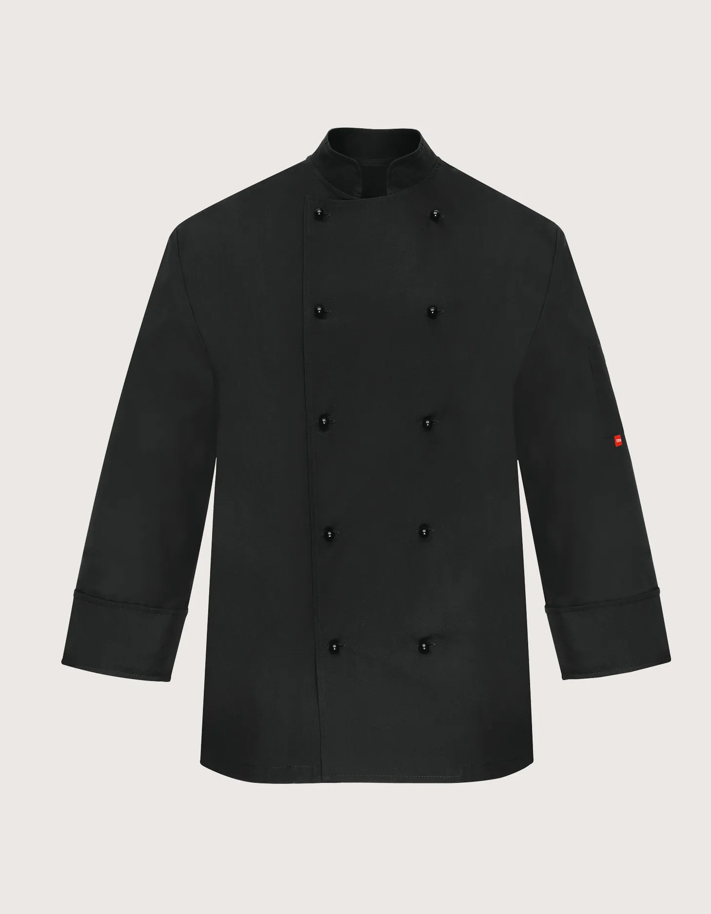 Mavi unisex chef jacket in black cotton with long sleeves. Features: 100% cotton; ventilation mesh on the back; pocket on the left sleeve. Closure: snap buttons. Available sizes: XS to XXXL. Washable up to 60°C. 100% Made in Italy. Suitable as professional attire for kitchens, pastry, gastronomy, and food laboratories. Also available in white.