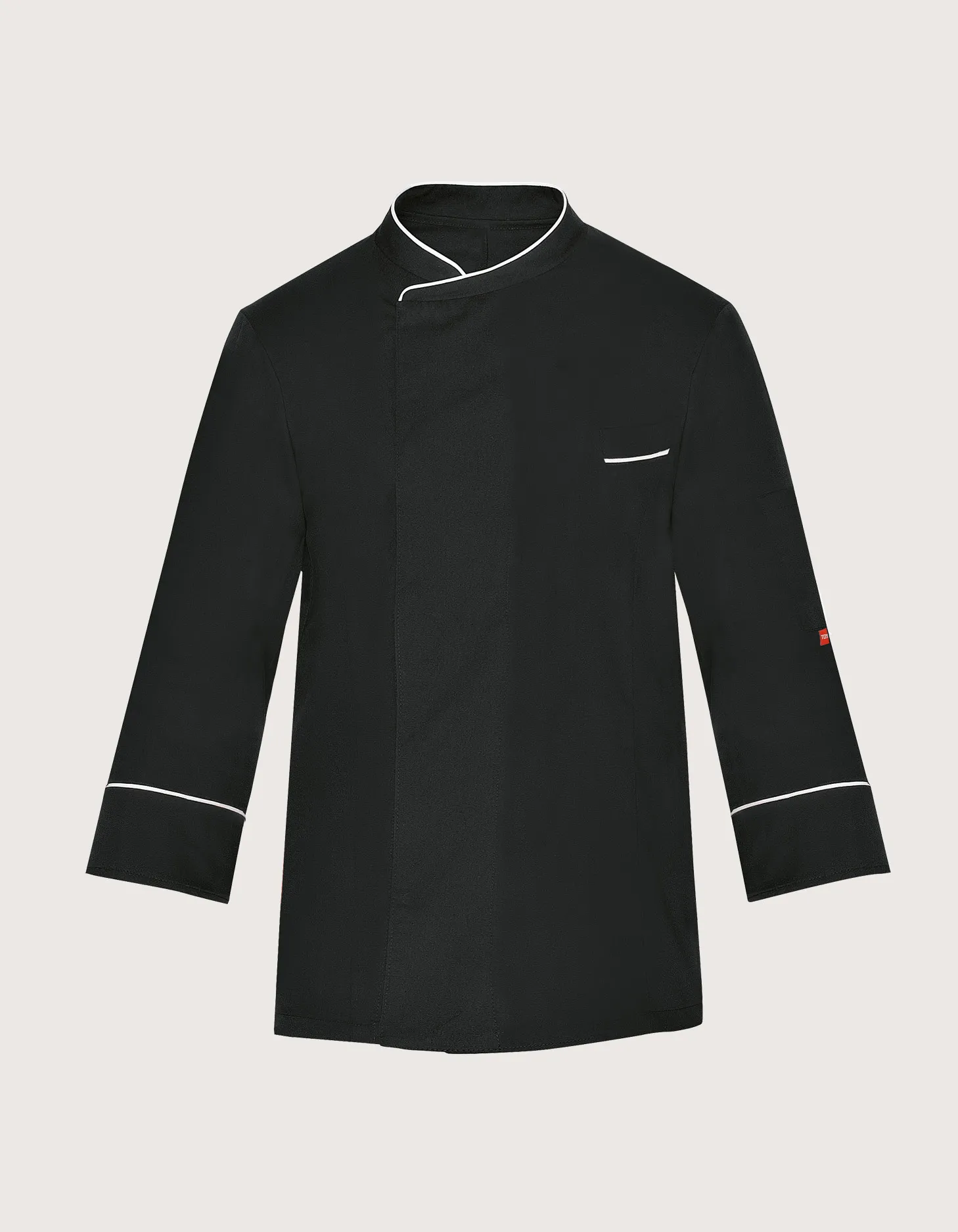 Unisex black chef jacket “Omega”, long sleeves with white details on the collar, pocket, and sleeves. Features: fabric blend: 65% polyester / 35% cotton; underarm ventilation mesh; chest pocket and left sleeve pocket. Closure: side snap buttons covered – not in contact with the skin. Available sizes: from XS to XXXL. Washable up to 70°C. 100% Made in Italy. Suitable as a professional uniform for kitchens, pastry shops, gastronomy, and food laboratories. Also available in white and grey.