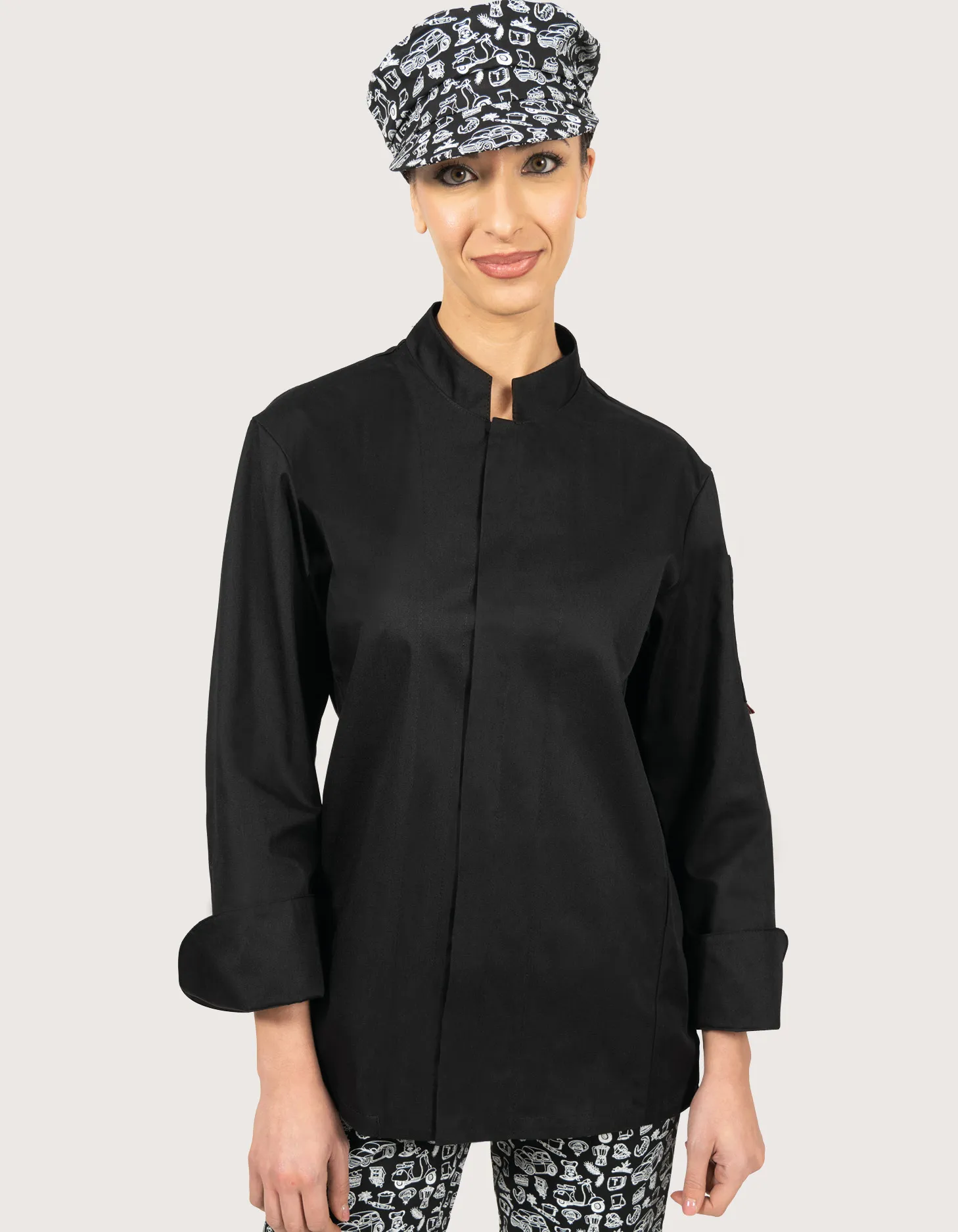 Unisex black chef jacket with mandarin collar “Zugo”, long sleeves. Features: 35% cotton and 65% polyester blend fabric; ventilation mesh on the back; small pocket on the left sleeve. Closure: central fastening with covered press studs, not in contact with the skin. Available sizes: from XS to XXXL. Washable up to 70°C. 100% Made in Italy. Suitable as a professional uniform for kitchens, pastry shops, gastronomy, and food laboratories. Also available in white.