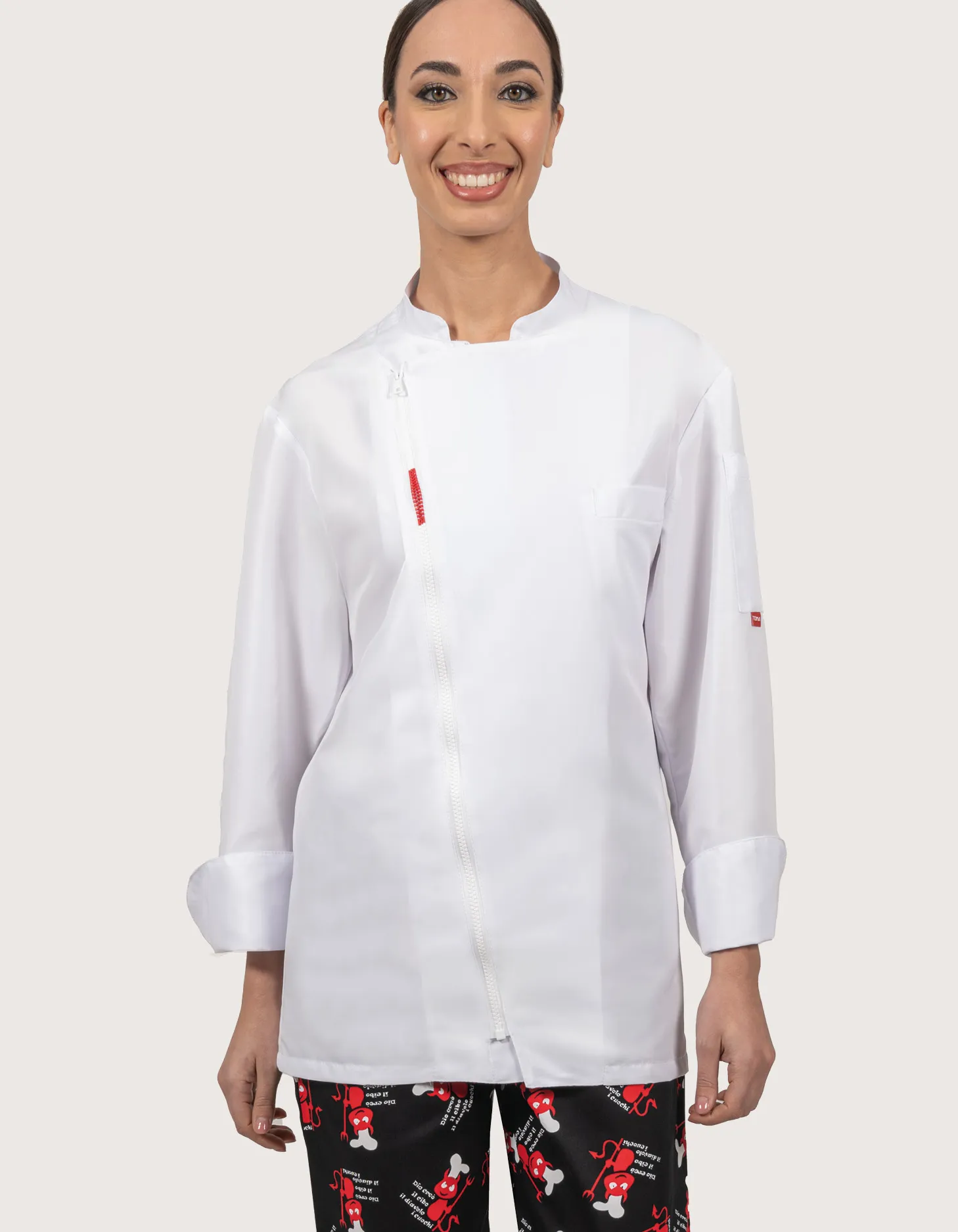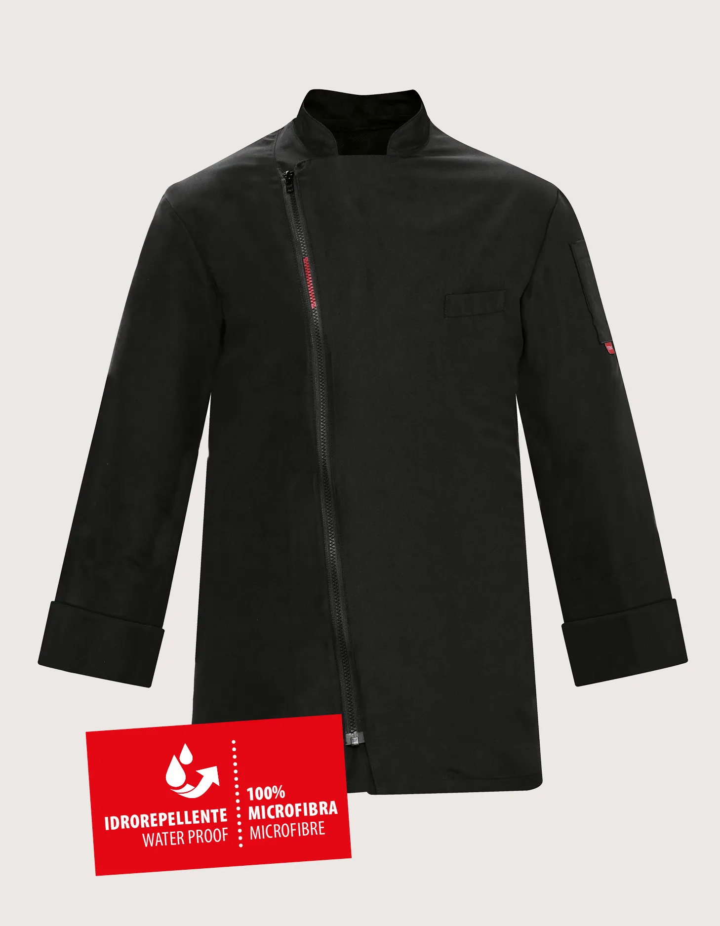 Unisex black chef jacket “Rian”, long sleeves. Features: 100% microfiber fabric, water-repellent and stain-resistant; ventilation mesh on the back; chest pocket and left sleeve pocket. Closure: quick side zipper. Available sizes: from XS to XXXL. Washable up to 50°C. 100% Made in Italy. Suitable as a professional uniform for kitchens, pastry shops, gastronomy, and food laboratories. Also available in white.