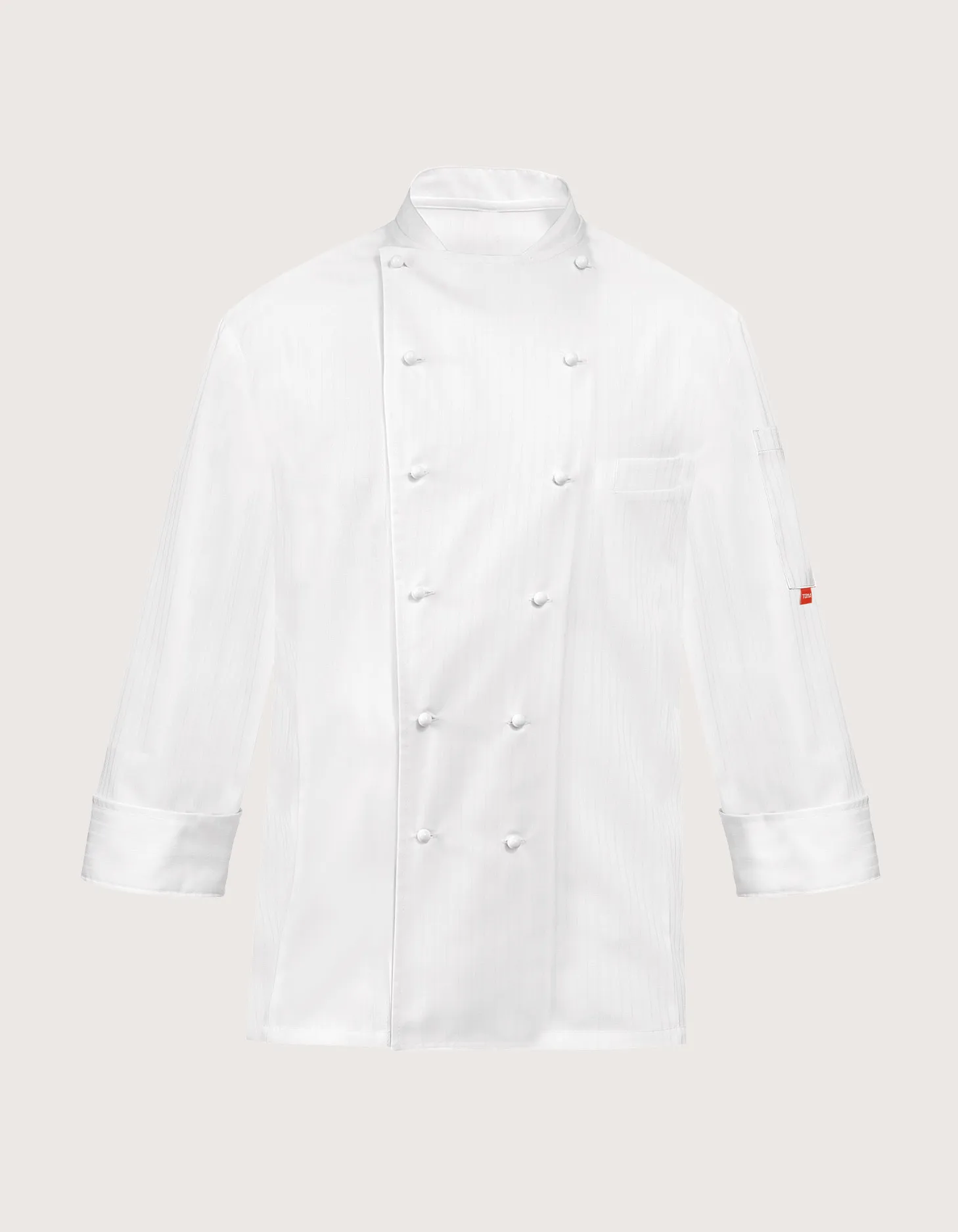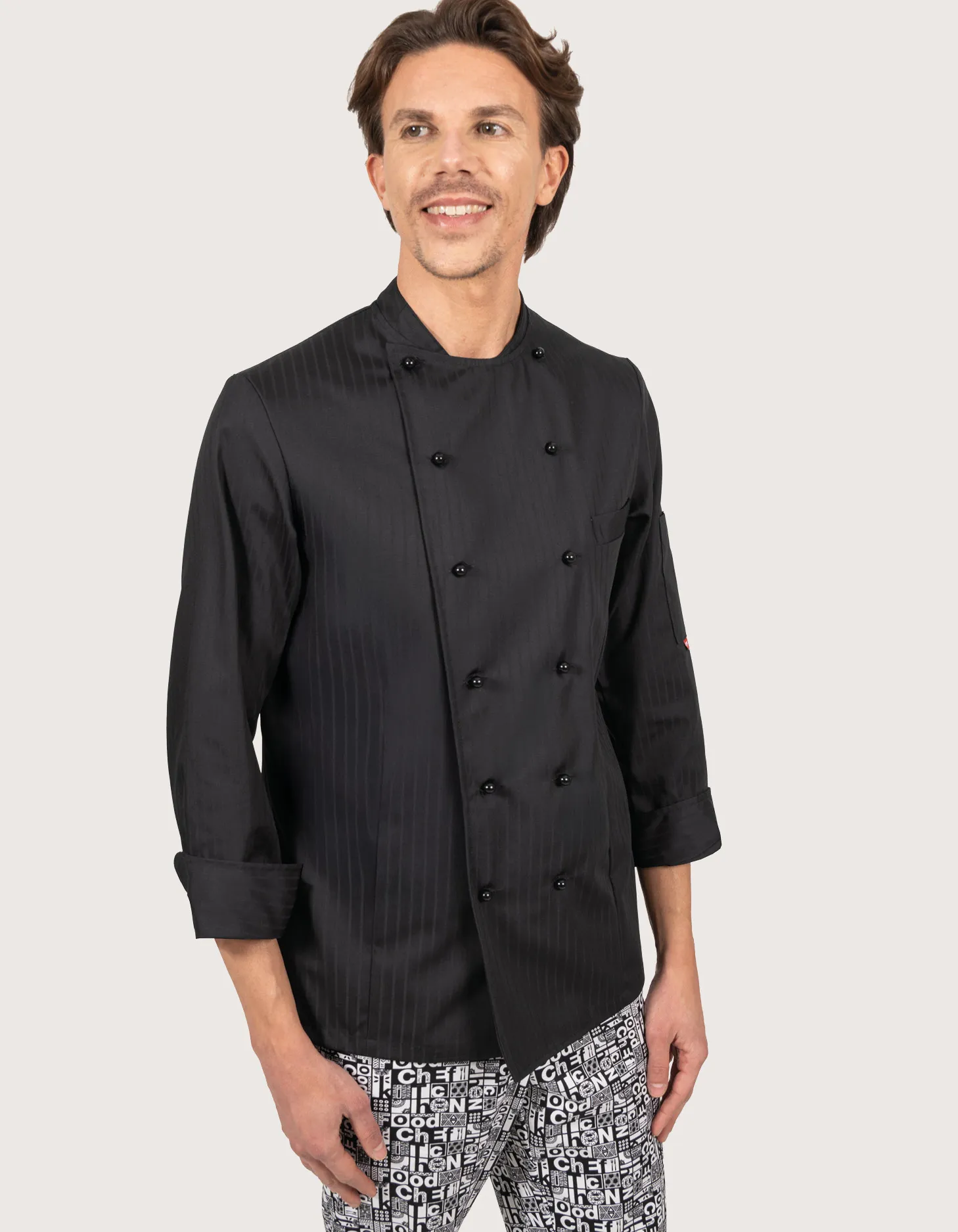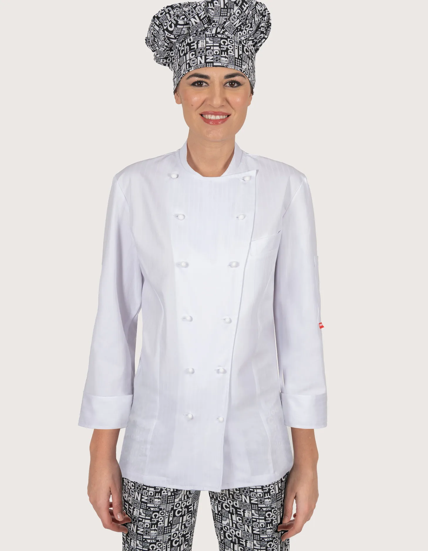 Giotto unisex white chef jacket, long sleeves. Features: fabric blend: 65% polyester / 35% cotton; chest pocket and left sleeve pocket. Closure: classic double-breasted button fastening. Comfort fit. Available sizes from XS to XXXL. Washable up to 95°C. 100% Made in Italy. Suitable as a uniform for kitchens, pastry shops, gastronomy, and food laboratories. Also available in black