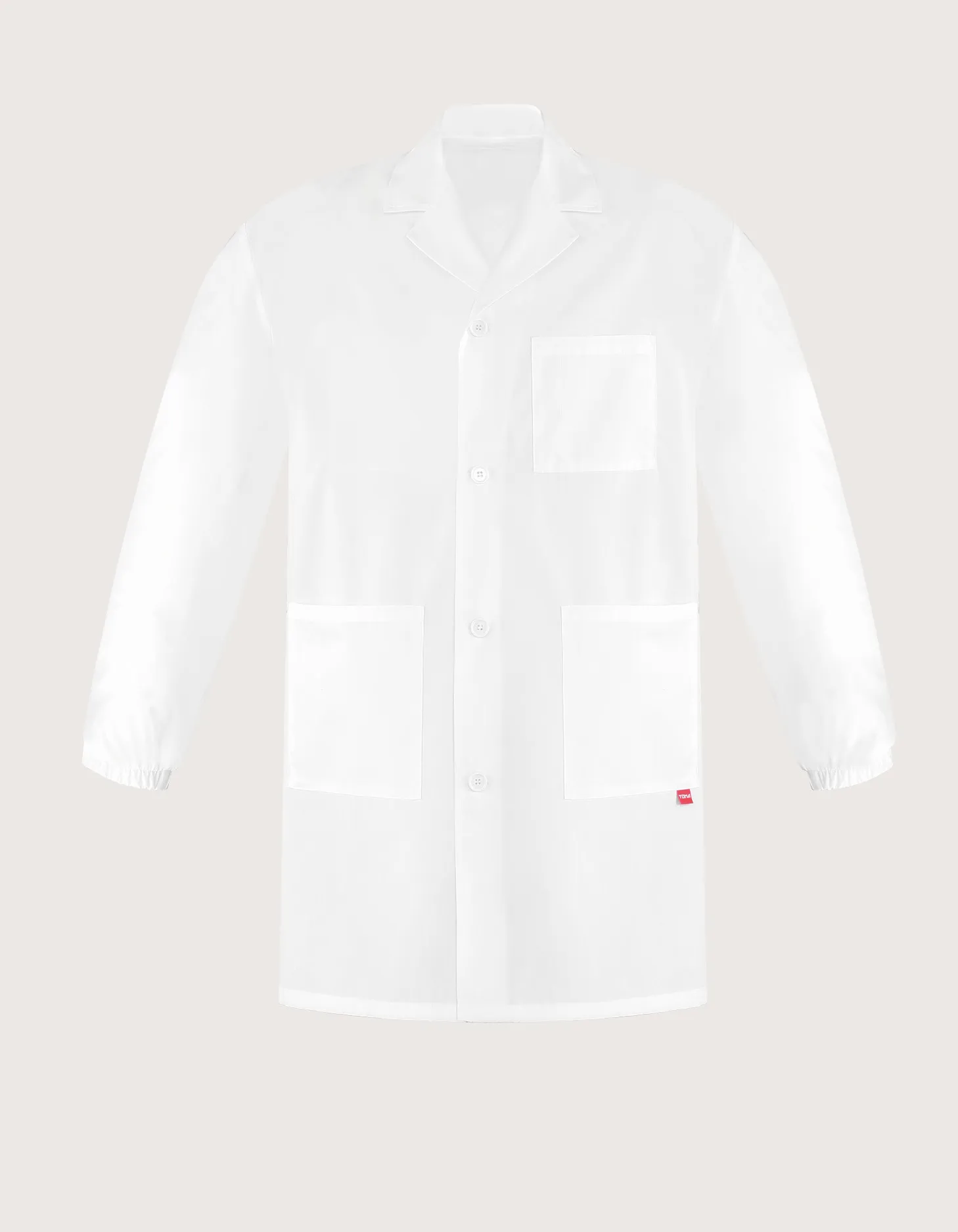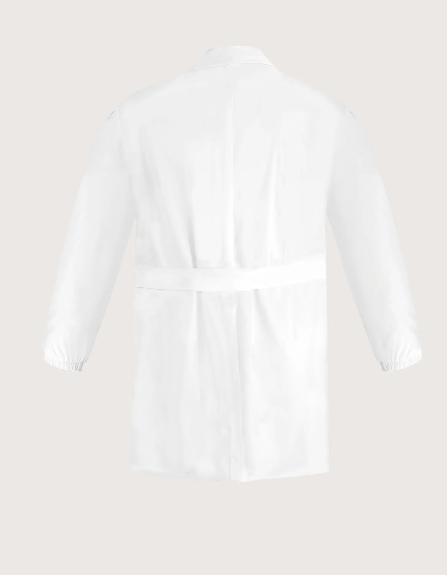 Men’s lab coat with elastic cuffs; two side pockets and one chest pocket.