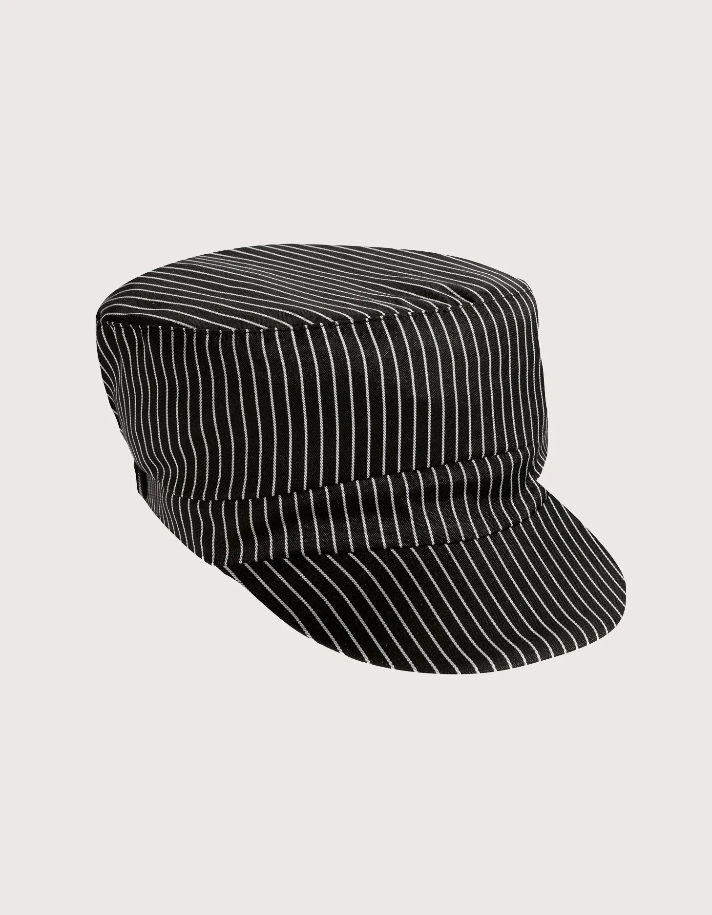 Pair of unisex chef hats in 100% cotton, featuring an elastic back and black pinstripe fabric. Machine washable up to 60 degrees. The “Liam” collection is also available in: