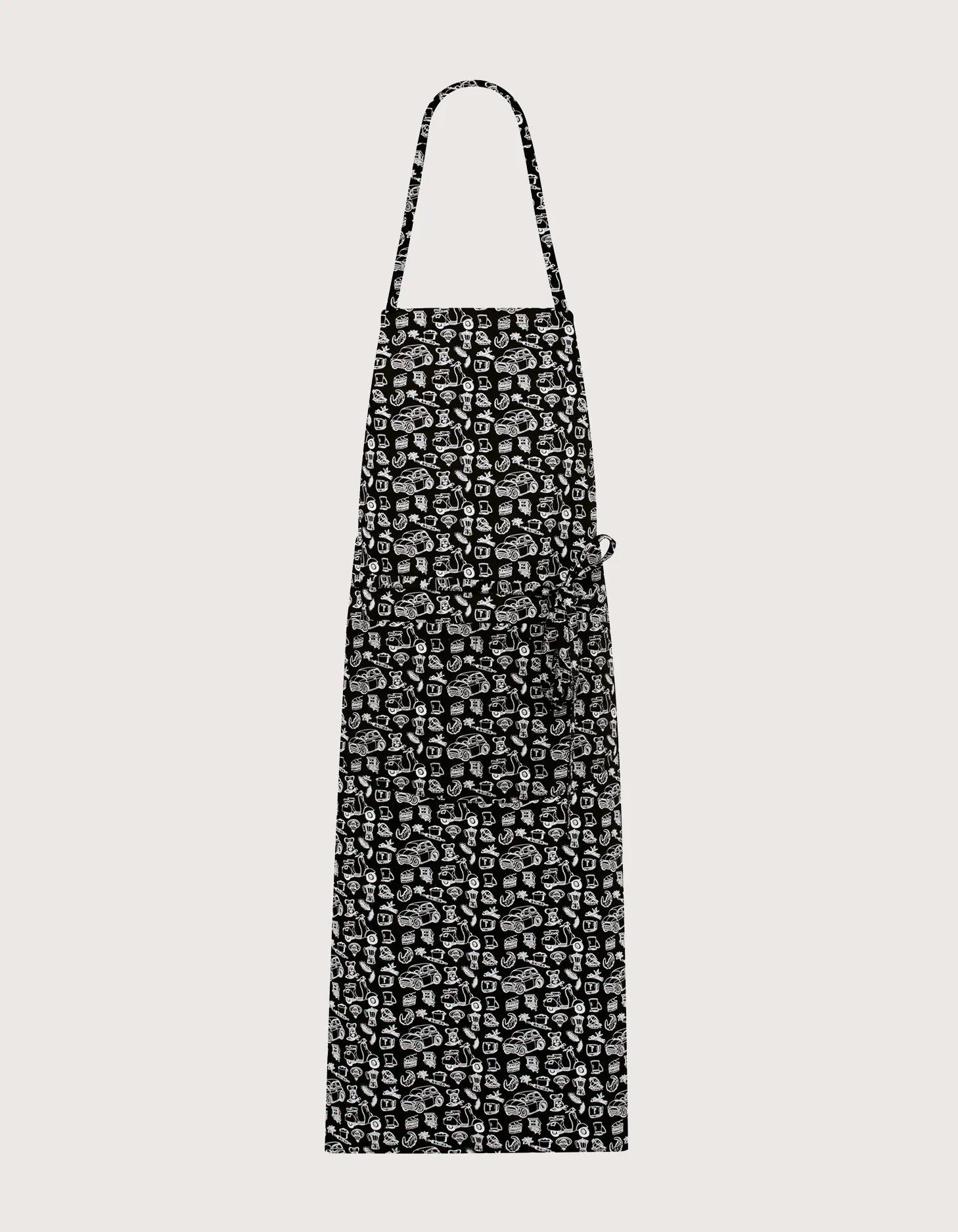 Features: 100% cotton fabric, large central pocket divided into two compartments, adjustable velcro neck and waist ties. Washing guaranteed up to 60°C. 100% Made in Italy.