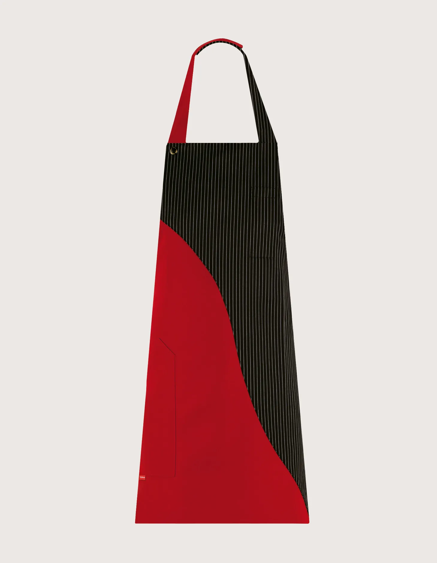 Unisex apron with bicolored bib in Black Pinstripe-Red. One size fits all, adjustable neck with velcro, with two pockets: one pen pocket on the chest and one side pocket, back tie closure. Fabric 100% polyester, machine washable up to 50°C.