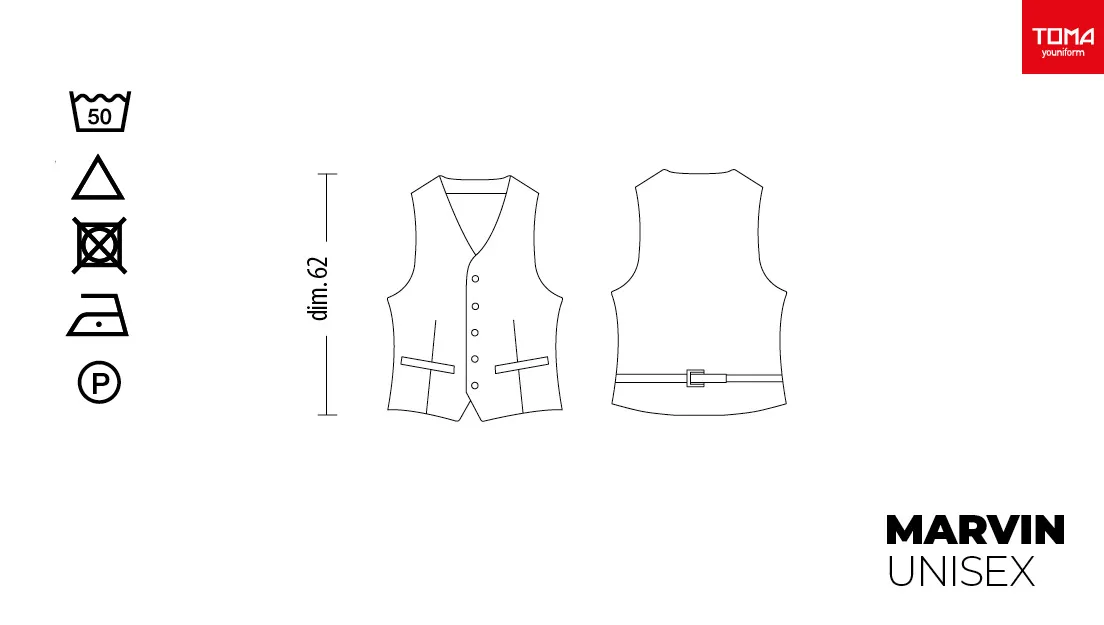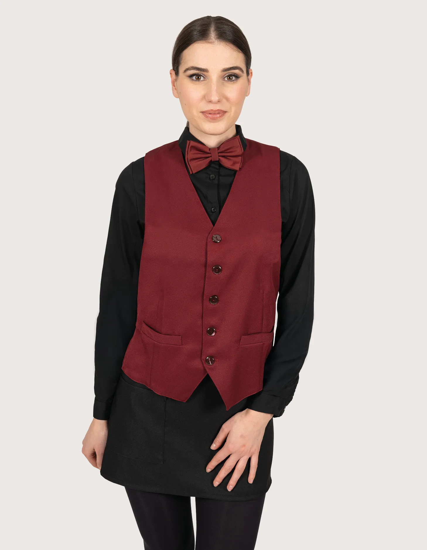 Unisex vest in 100% polyester, h 62. Available colors: black pinstripe, burgundy, burgundy pinstripe, black and red. Sizes from XS to XXL. Machine washable up to 50°C. 100% Made in Italy. Suitable as part of service uniforms.