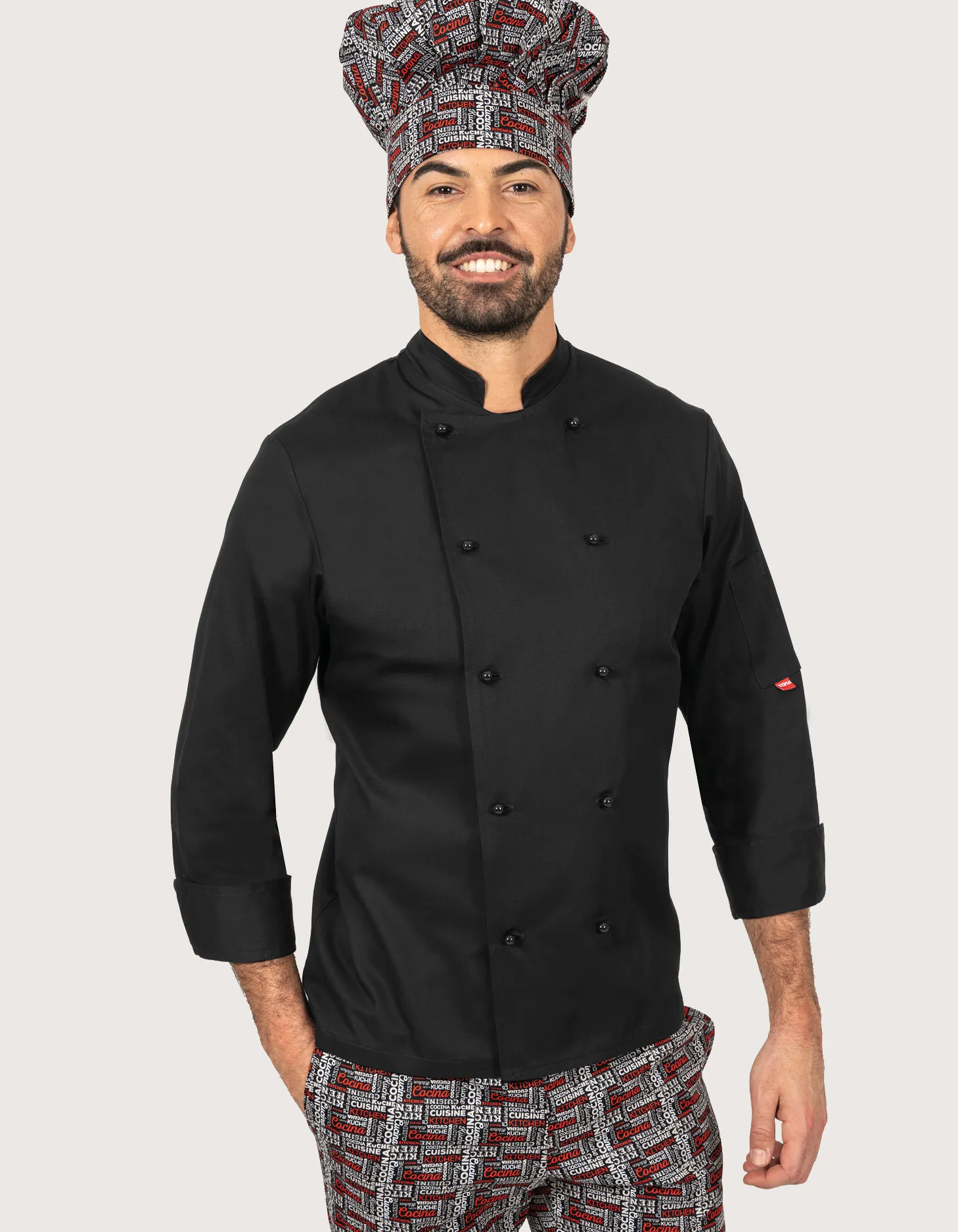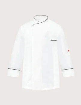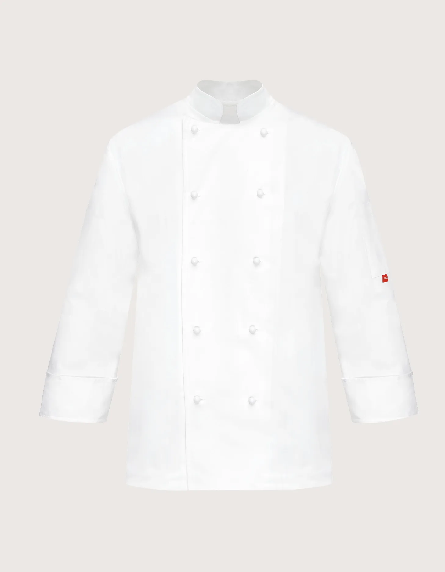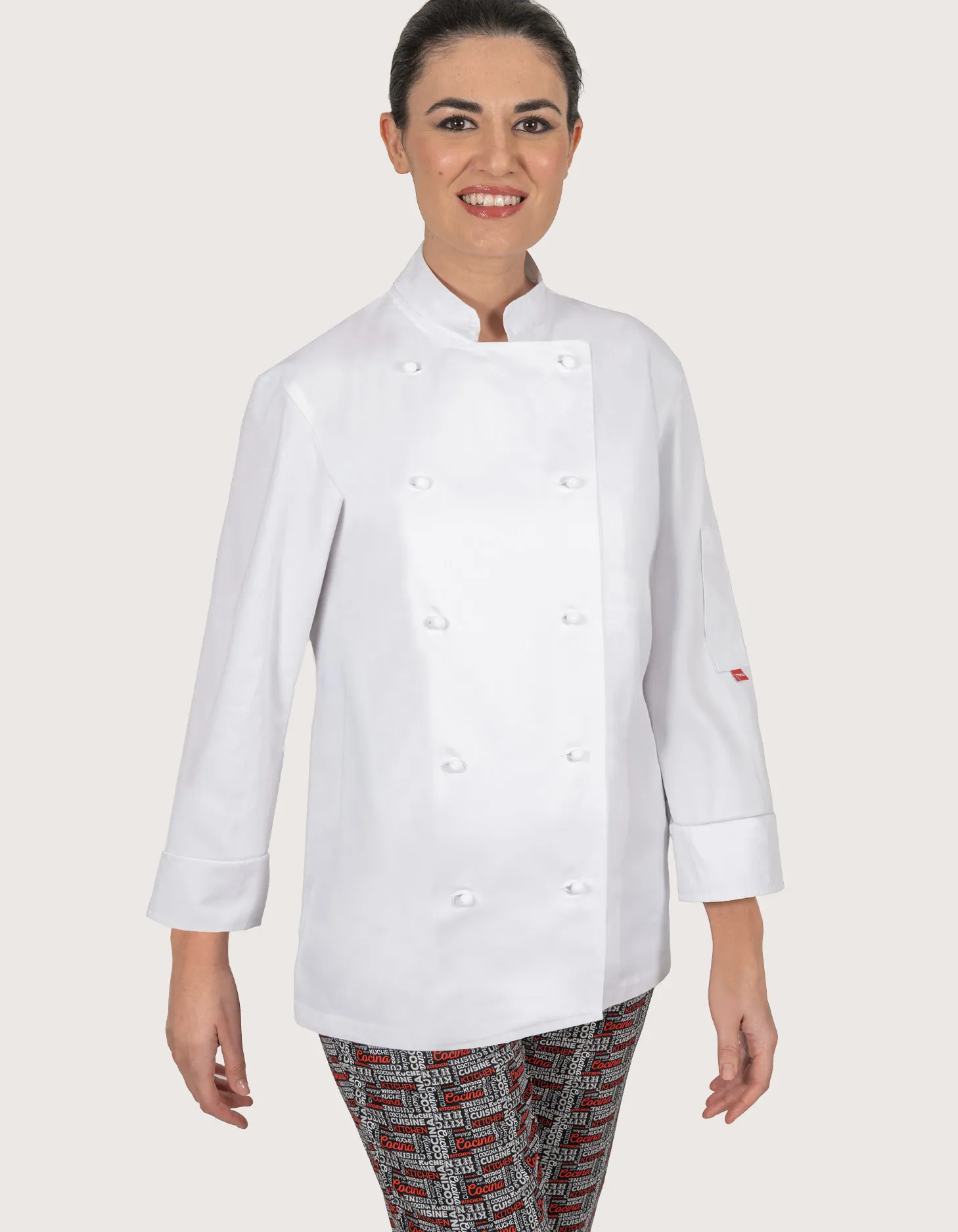 Mavi unisex chef jacket in white cotton with long sleeves. Features: 100% cotton; ventilation mesh on the back; pocket on the left sleeve. Closure: snap buttons. Available sizes: XS to XXXL. Washable up to 60°C. 100% Made in Italy. Suitable as professional attire for kitchens, pastry, gastronomy, and food laboratories. Also available in black.