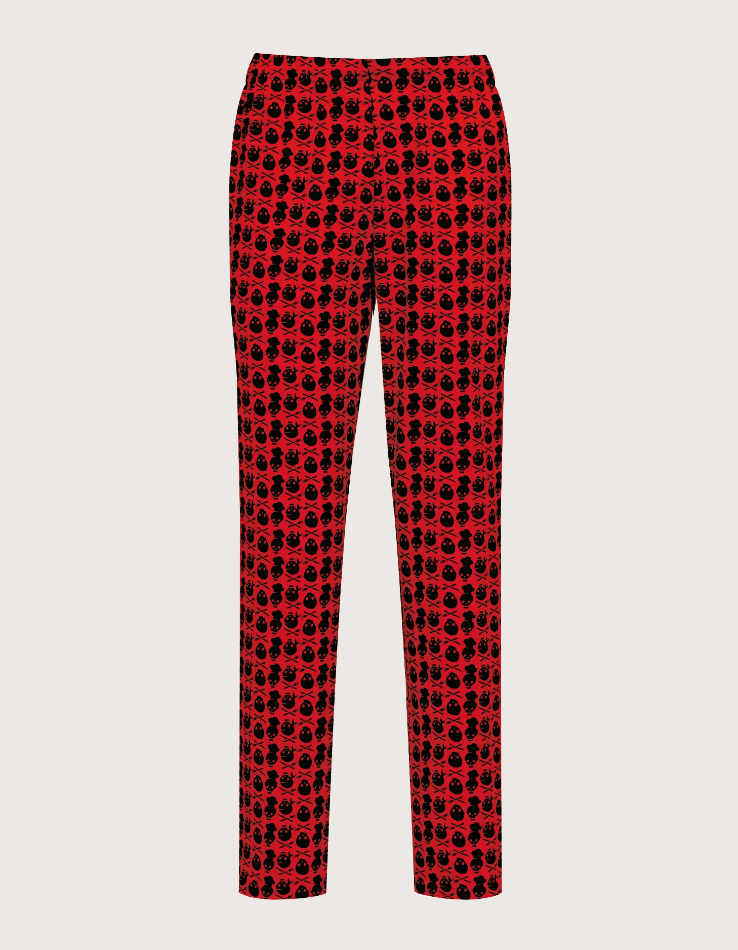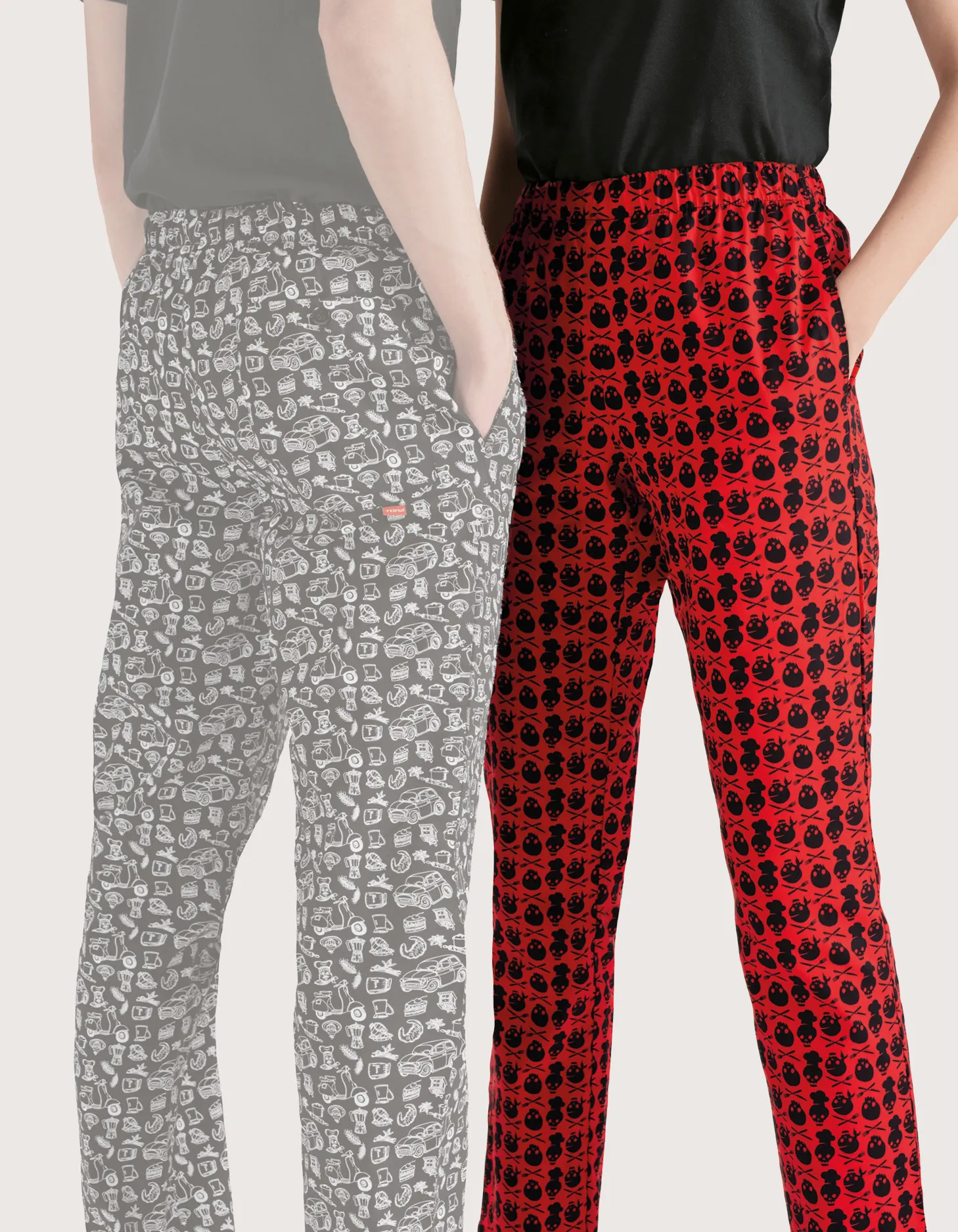 Unisex chef/cook pants with elastic waistband and drawstring closure. Available colors: black with the fun white “Italy” pattern and red with the black “Skull” pattern. Features: 100% cotton fabric; three pockets: two side and one back. Comfort fit. Sizes available from XS to XXXL. Washable up to 60°C. 100% Made in Italy. Suitable as part of a uniform for kitchens, pastry shops, gastronomy, and food laboratories.