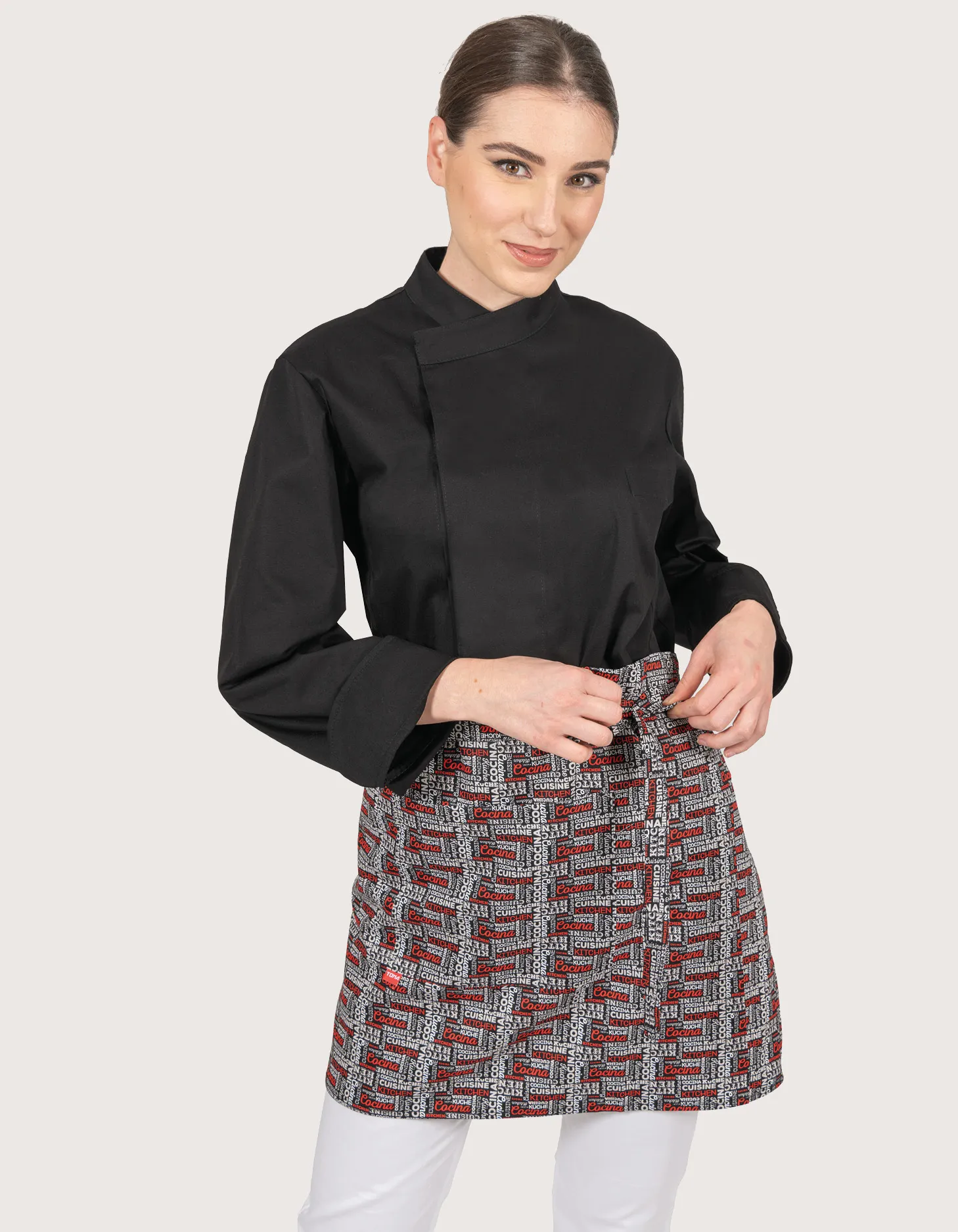 The Nevada apron is also available in other prints: Black & White, Devil, Superheroes, Game Over, New York, Newspaper, Skull, Italy; in checked fabrics: Blue & Black Pinstripe; also available in plain: Black. Professional clothing ideal for kitchens, pastry shops, gastronomy, and food laboratories.