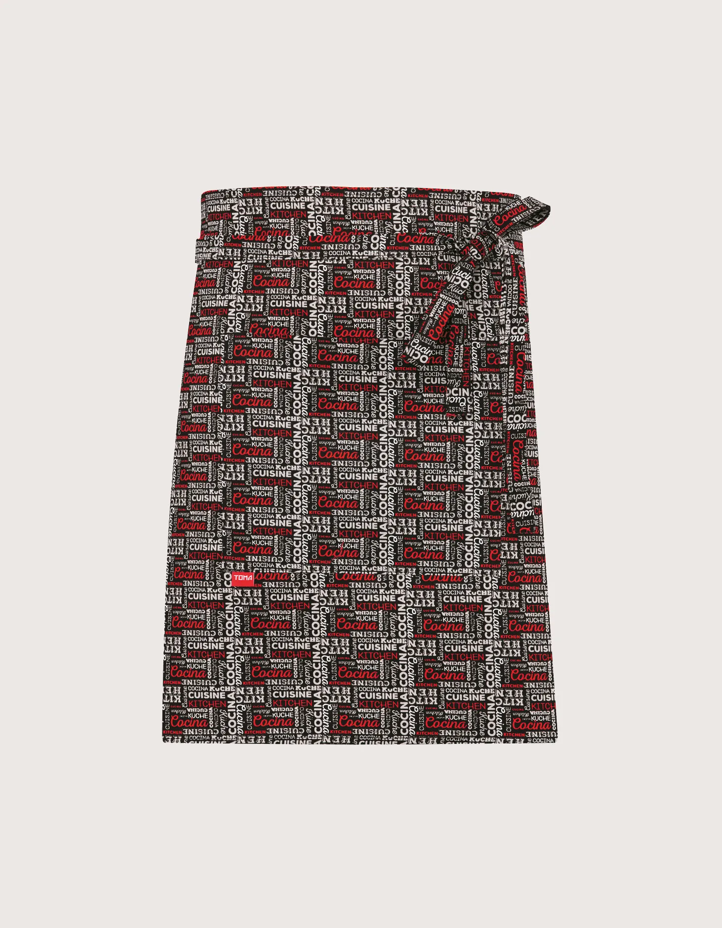 “Kitchen” print can be coordinated with pants, various aprons with or without bib, hats, bandanas, and chef uniform accessories. Made by Toma Youniform, 100% Made in Italy.