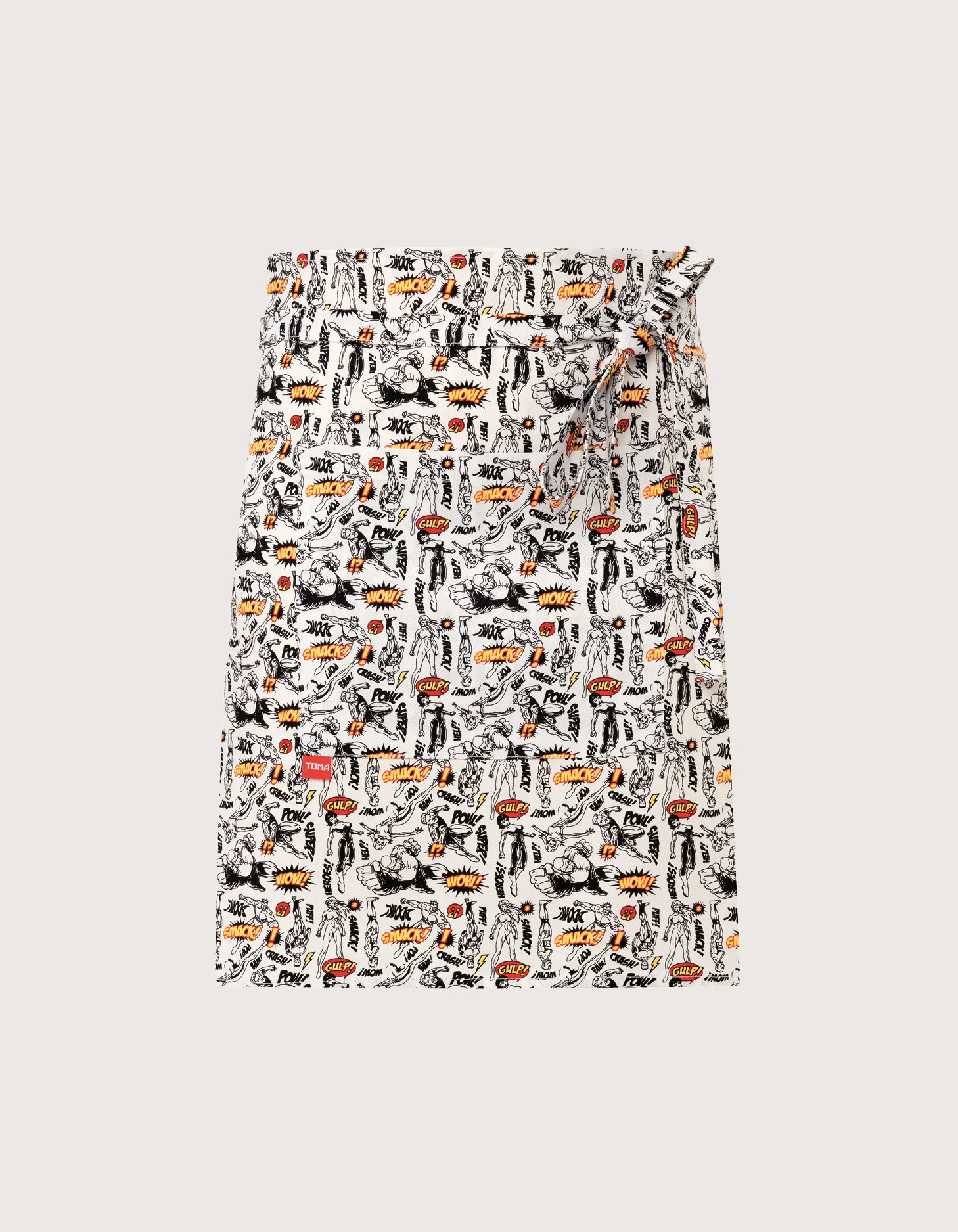 “Superheroes” print can be coordinated with pants, various aprons with or without bib, hats, bandanas, and chef uniform accessories.