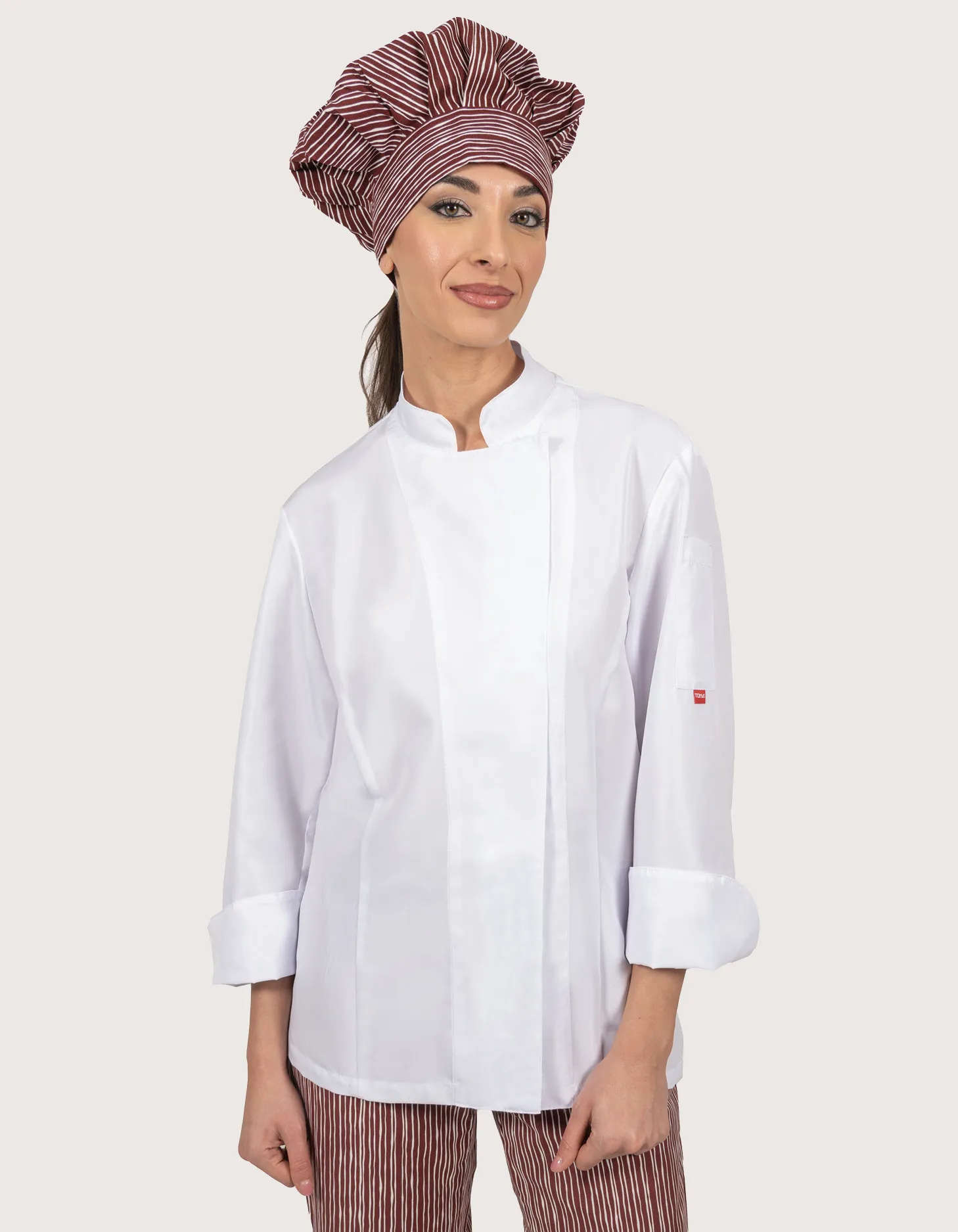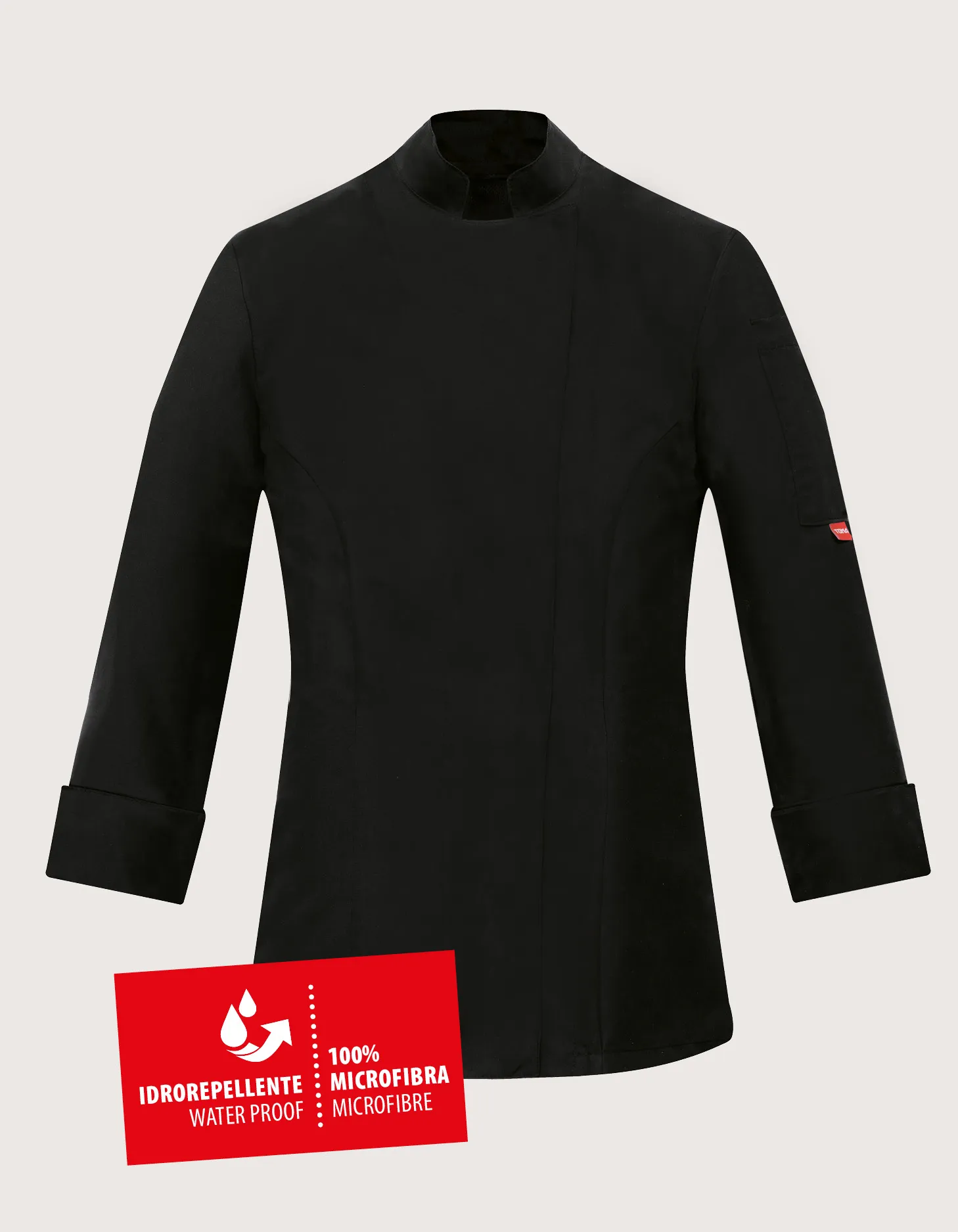 Women’s chef jackets, long sleeves. Available colors: white and black. Features: 100% microfiber fabric, water-repellent and stain-resistant; ventilation mesh on the back; small pocket on the left sleeve. Closure: side fastening with covered press studs, not in contact with the skin. Available sizes: from XS to XXL. Washable up to 50°C. 100% Made in Italy. Suitable as a professional uniform for kitchens, pastry shops, gastronomy, and food laboratories.