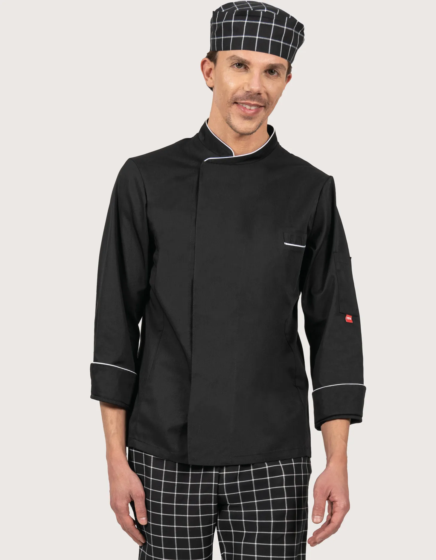 Unisex white chef jacket “Omega”, long sleeves with black details on the collar, pocket, and sleeves. Features: fabric blend: 65% polyester / 35% cotton; underarm ventilation mesh; chest pocket and left sleeve pocket. Closure: side snap buttons covered – not in contact with the skin. Available sizes: from XS to XXXL. Washable up to 70°C. 100% Made in Italy. Suitable as a professional uniform for kitchens, pastry shops, gastronomy, and food laboratories. Also available in black and grey.