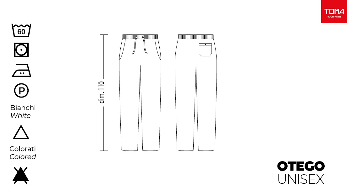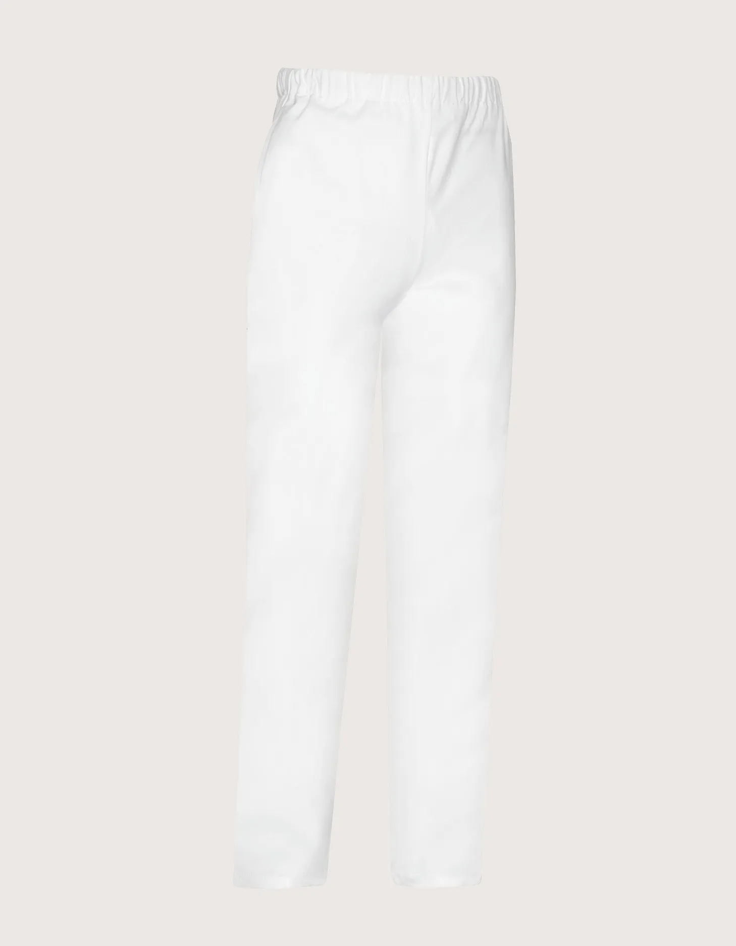 Unisex chef/cook pants with elastic waistband and drawstring closure. Features: 100% cotton fabric; two functional side pockets and one back pocket. Sizes available from XS to XXXL. Machine washable up to 60°C. 100% Made in Italy. Suitable as part of the uniform for kitchens, pastry shops, gastronomy, and food laboratories. Comfort fit. Also available in black.