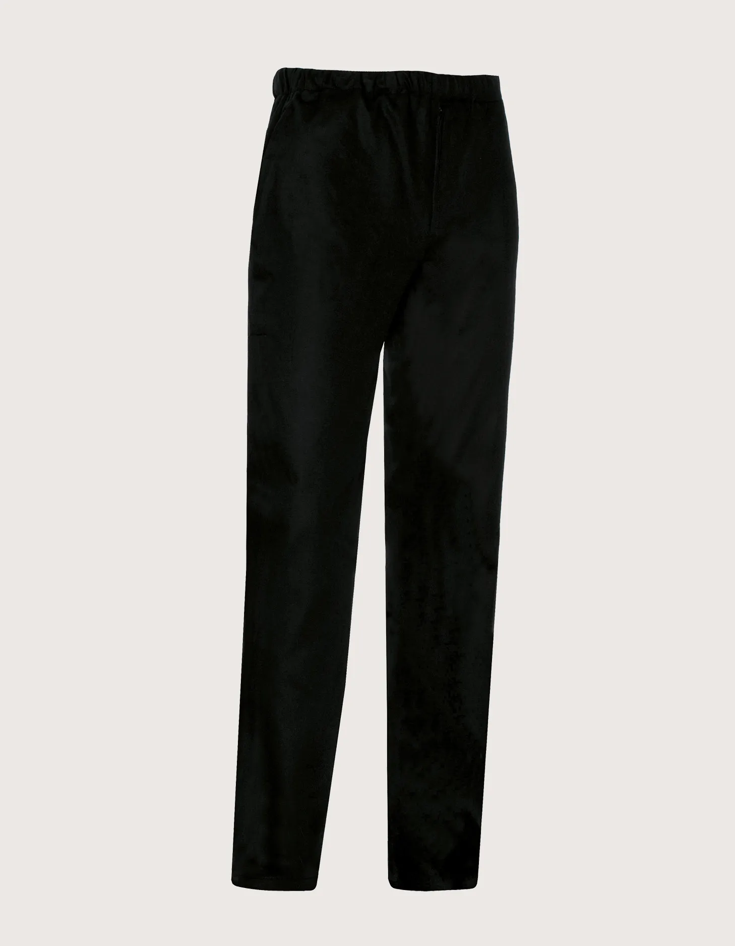 “Otego” black unisex chef/cook pants with elastic waistband and drawstring closure. Features: 100% cotton fabric; two functional side pockets and one back pocket. Sizes available from XS to XXXL. Machine washable up to 60°C. 100% Made in Italy. Suitable as part of the uniform for kitchens, pastry shops, gastronomy, and food laboratories. Comfort fit. Also available in white.