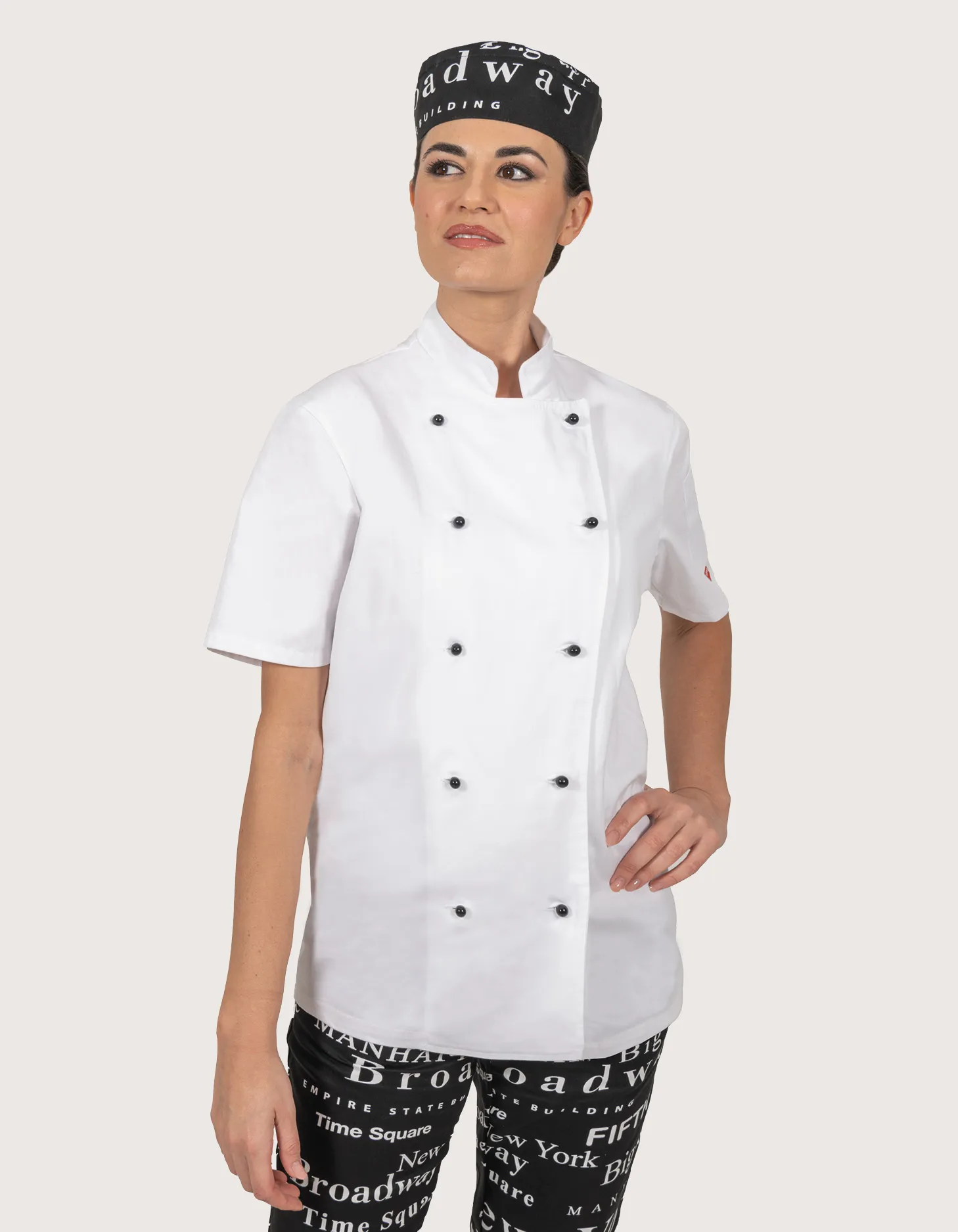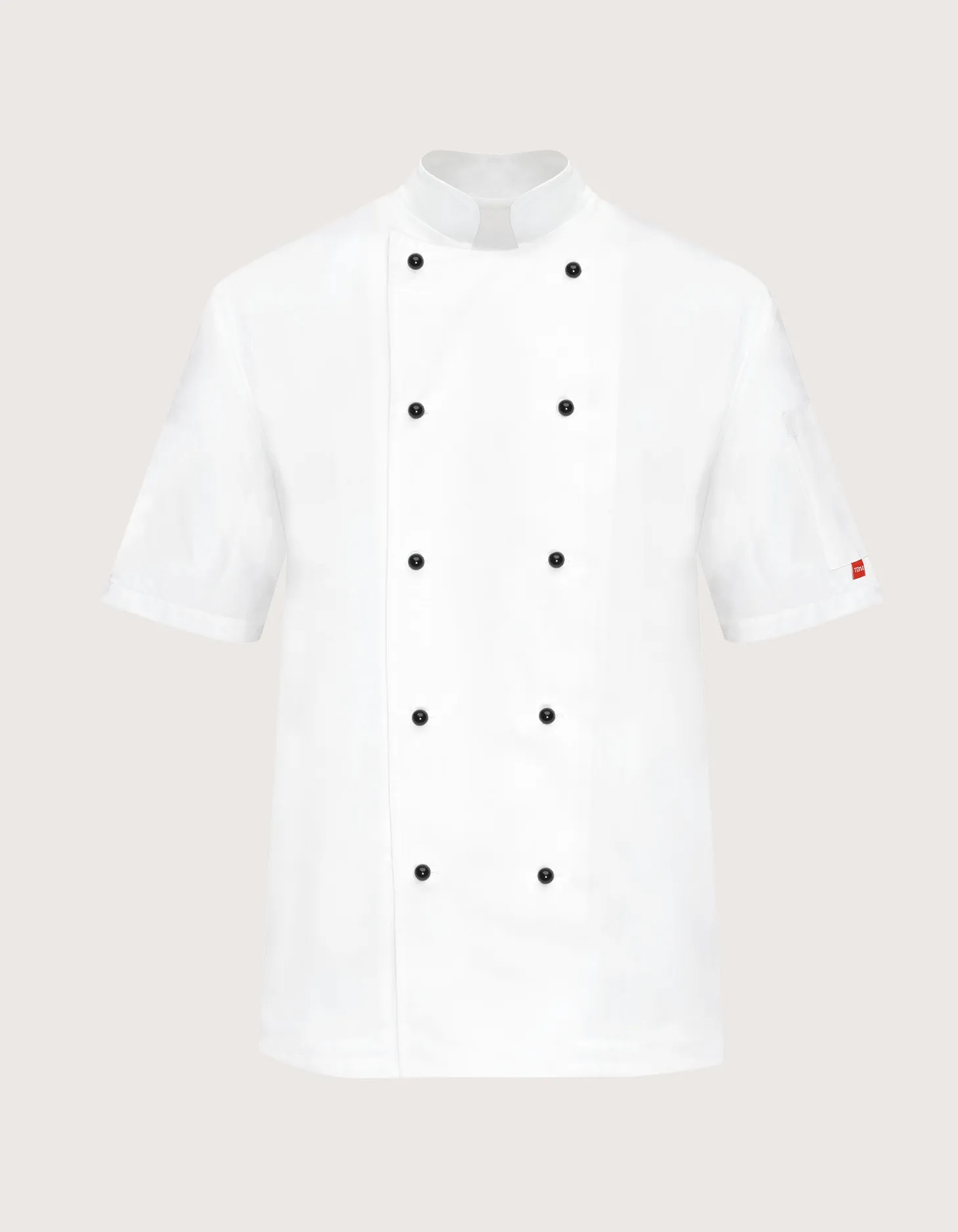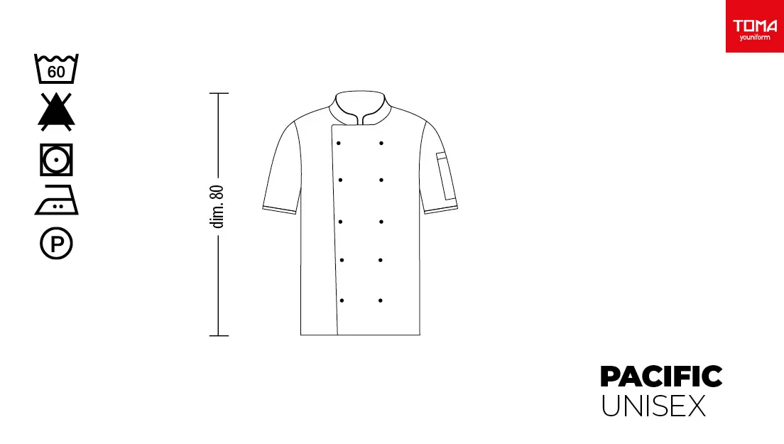 Unisex chef/cook jacket, short sleeves in white. Features: 100% cotton fabric; pocket on the left sleeve. Closure: central with 10 removable black buttons. Available sizes: XS to XXXL. Washing guaranteed up to 60°C. 100% Made in Italy. Suitable as a uniform for kitchens, pastry shops, gastronomy, and food laboratories.