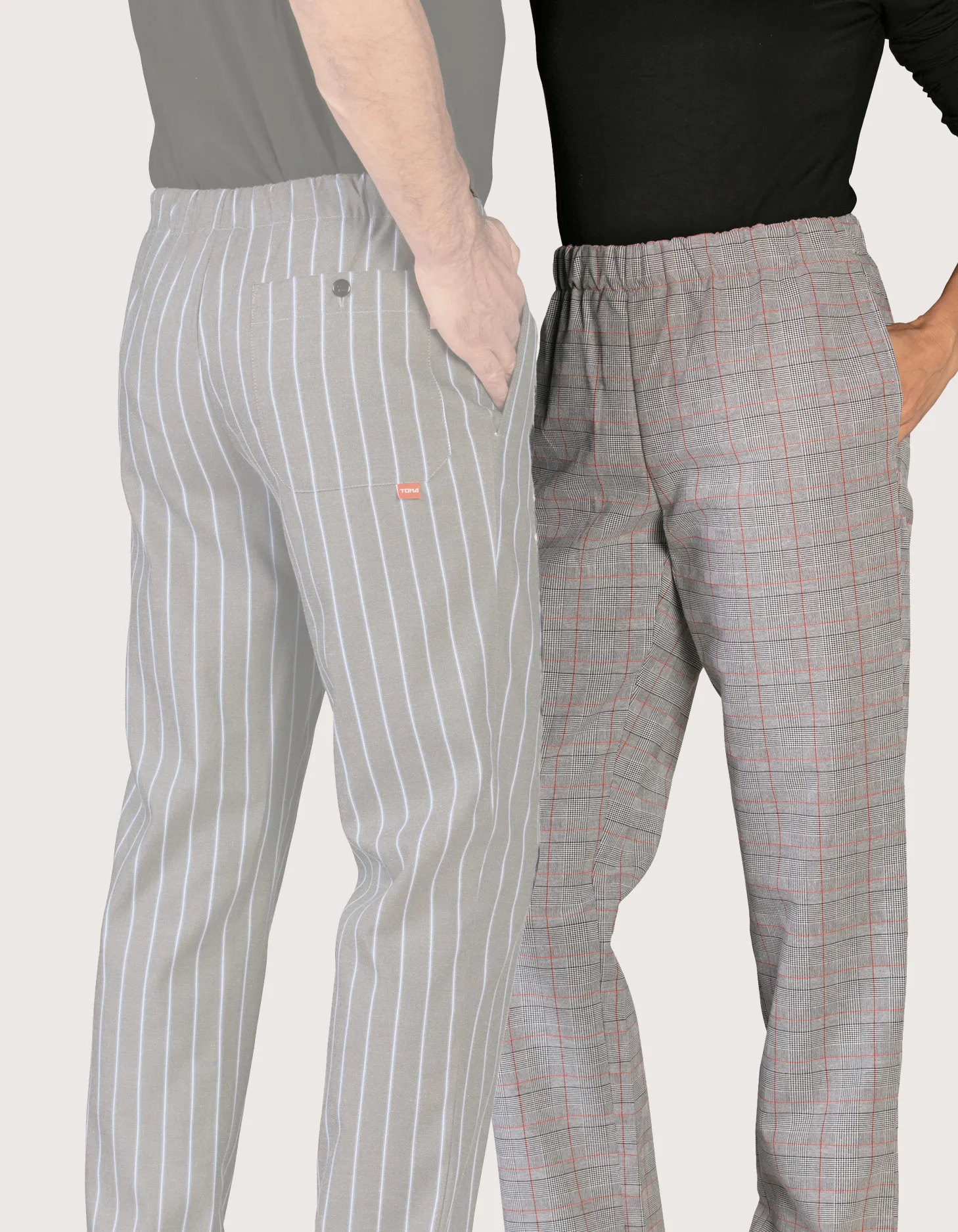 Unisex chef/cook pants available in “Prince of Wales” and “Blue Stripe” patterns. Features: 50% cotton and 50% polyester blend for comfort in every movement; elastic waistband with convenient drawstring closure, one large back pocket, and two practical side pockets. Comfort fit. Sizes available from XS to XXXL. Washable up to 60°C.