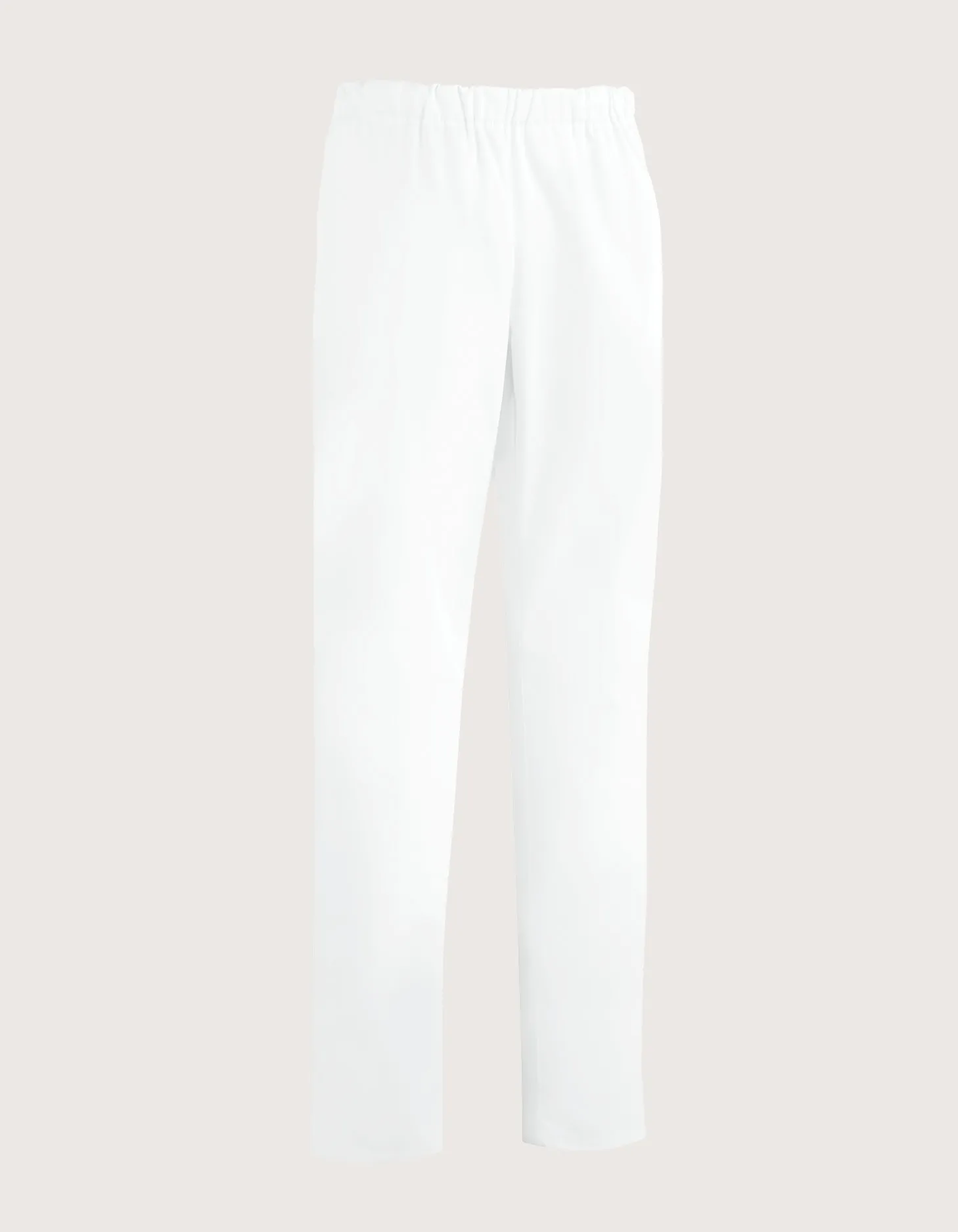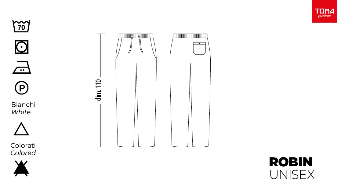 Unisex pants with drawstring & elastic waistband, featuring two large side pockets and one back pocket, available in white or yellow. Features: fabric blend 35% cotton, 65% polyester. Comfort fit. Sizes available from XS to XXXL. Washable up to 70°C. Robin pants are suitable for all sectors, from food service to medical, as they are practical, breathable, and hygienic.