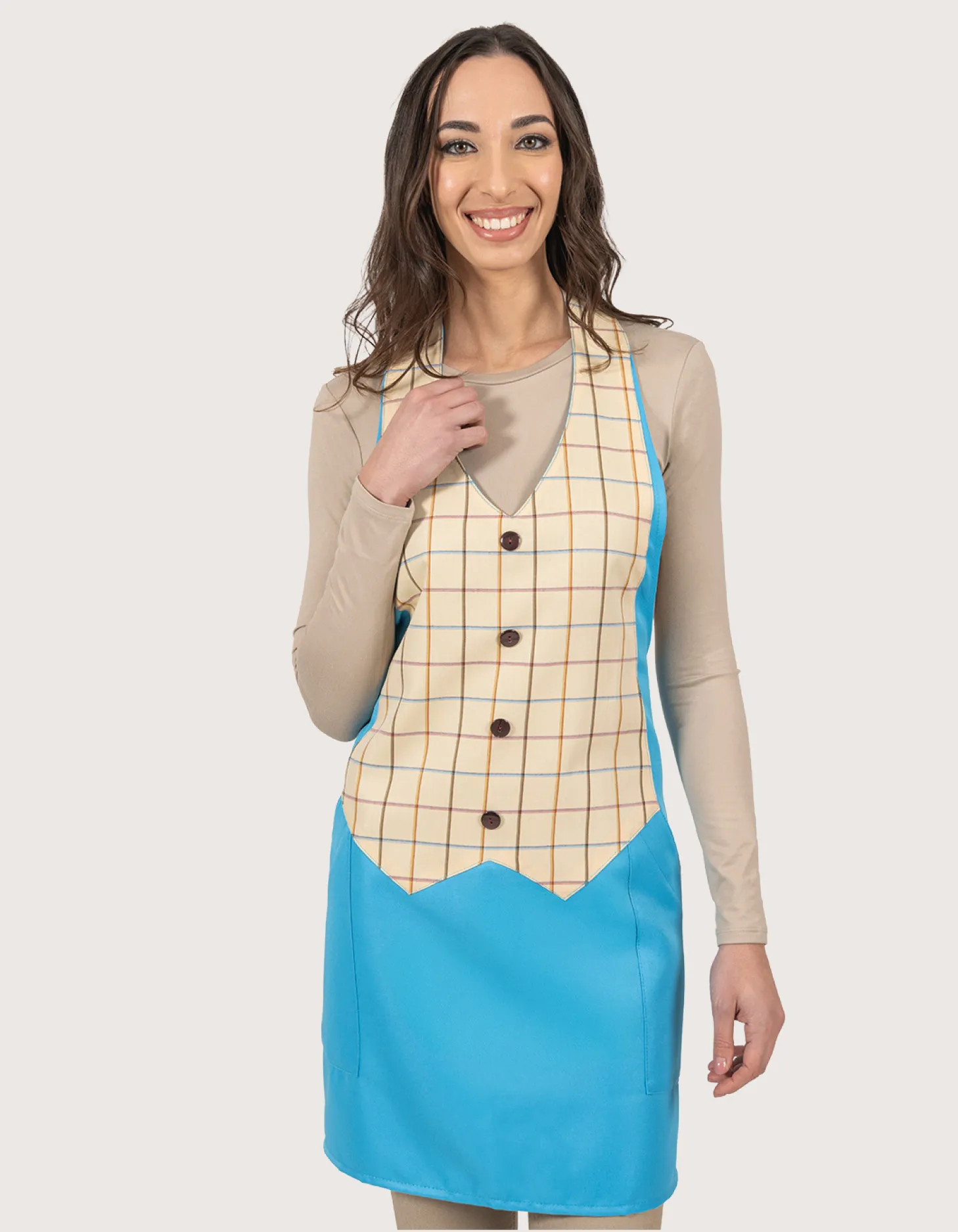 Simon apron unisex turquoise with tartan bib/vest. One size fits all, adjustable neck with velcro, two side pockets, and back closure with ties. Fabric: 100% polyester, machine washable up to 50°C. The Simon apron collection offers a wide range of colors and patterns: stripes, tartans, pinstripes, and Prince of Wales, all coordinating with other bib or non-bib aprons, hats, and accessories. Quick-drying and easy to iron, perfect as a uniform for restaurant and bar staff. Professional catering attire. 100% Made in Italy by Toma Youniform.