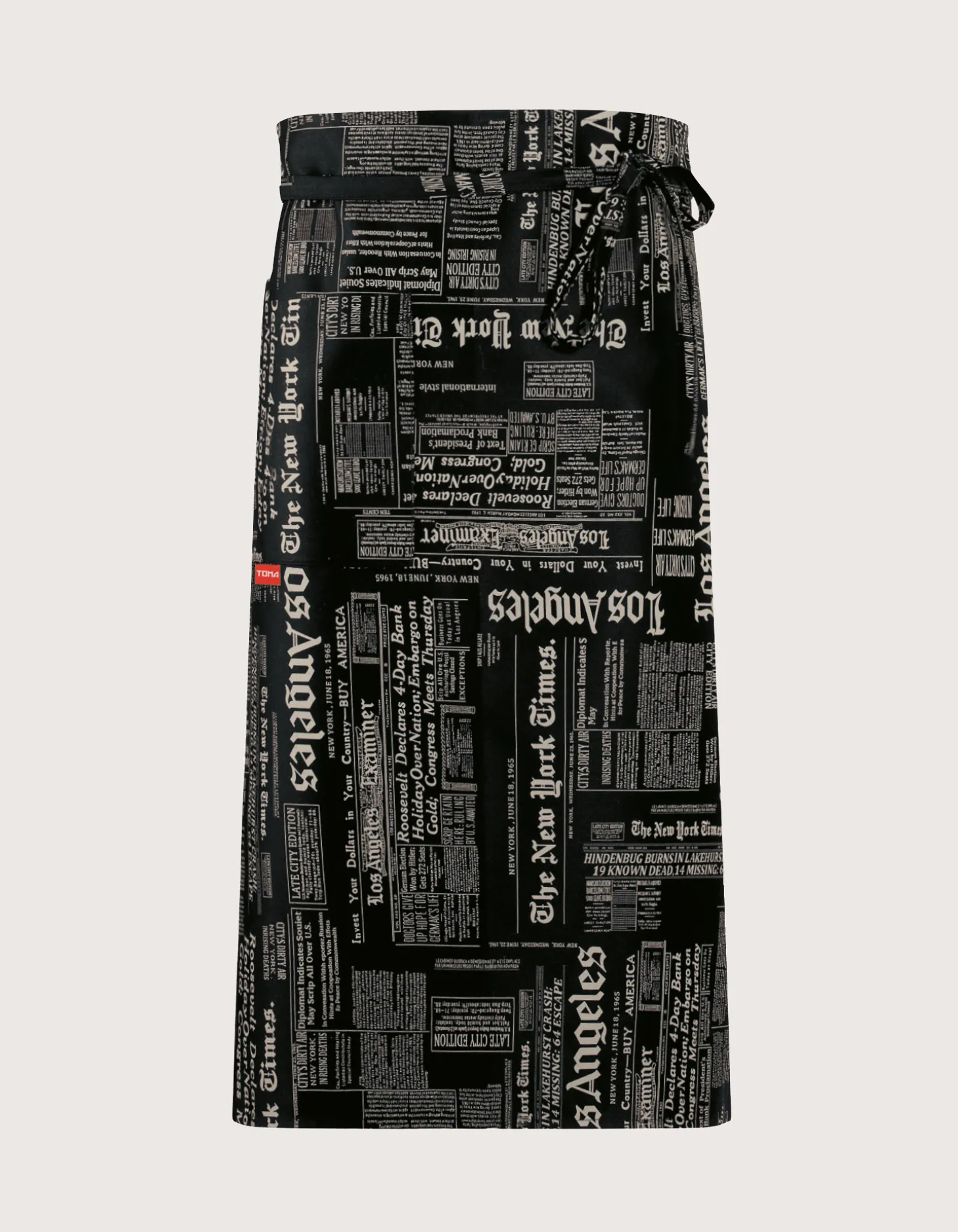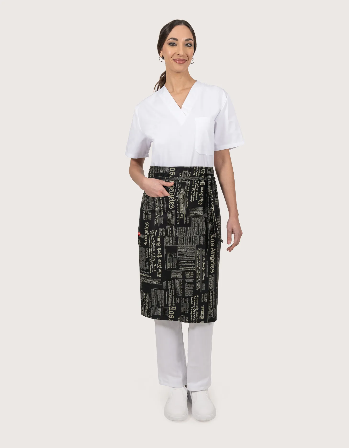 Pair of unisex aprons for chefs/cooks, 85×65, black with “Newspaper” print. Features: 100% cotton, without bib but with a useful side pocket and tie waist. Machine washable up to 60 degrees. 100% Made in Italy. Ideal for professional kitchens, restaurants, pubs, food labs, and delis.