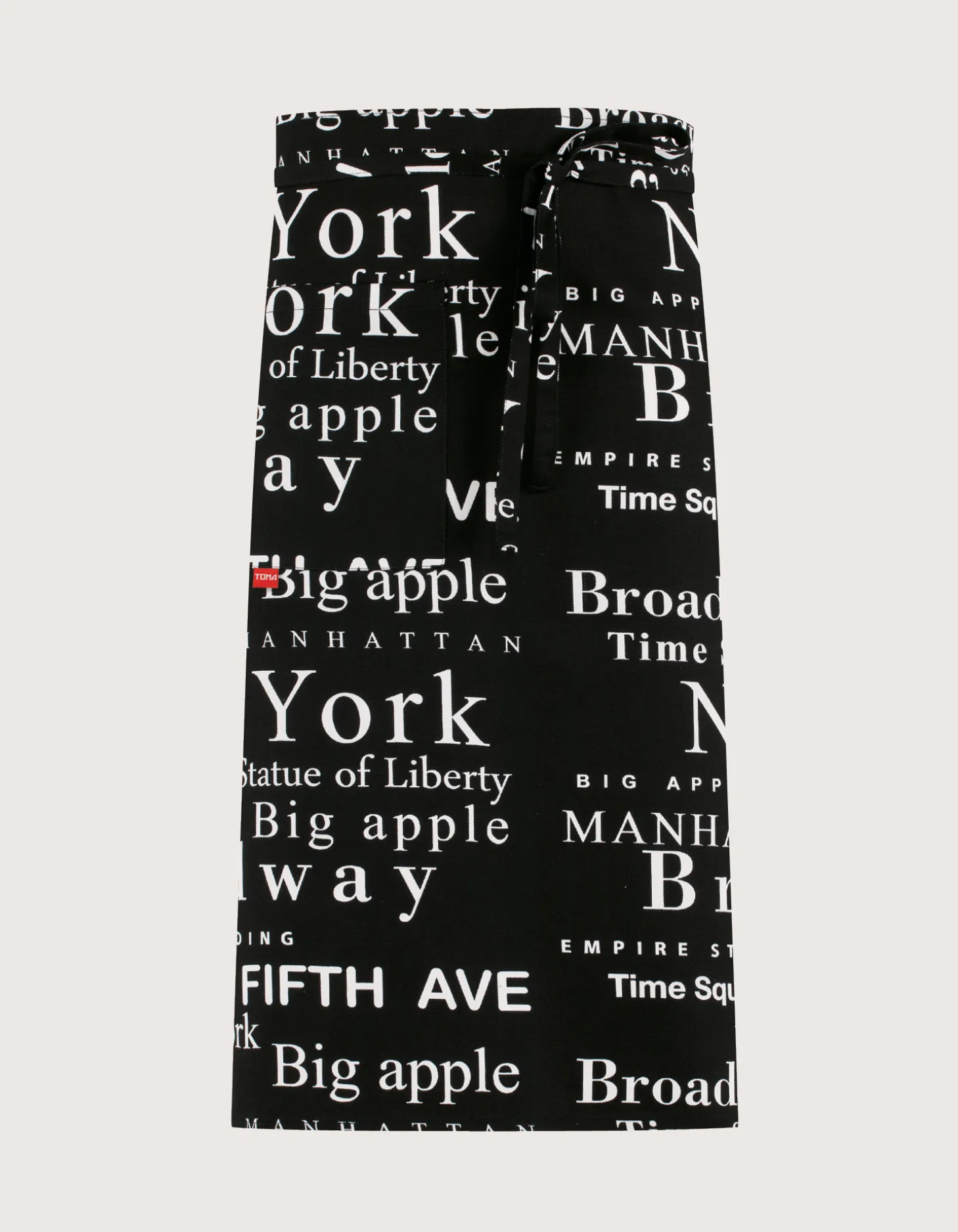 Pair of unisex aprons for chefs/cooks, 85×65, black with “New York” print. Features: 100% cotton, without bib but with a useful side pocket and tie waist. Machine washable up to 60 degrees. 100% Made in Italy. Ideal for professional kitchens, restaurants, pubs, food labs, and delis.