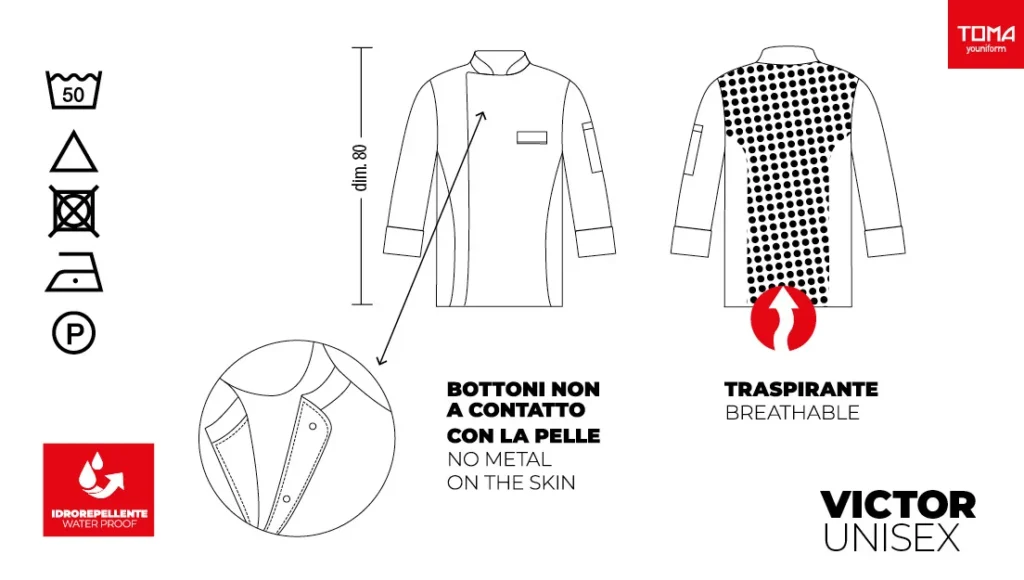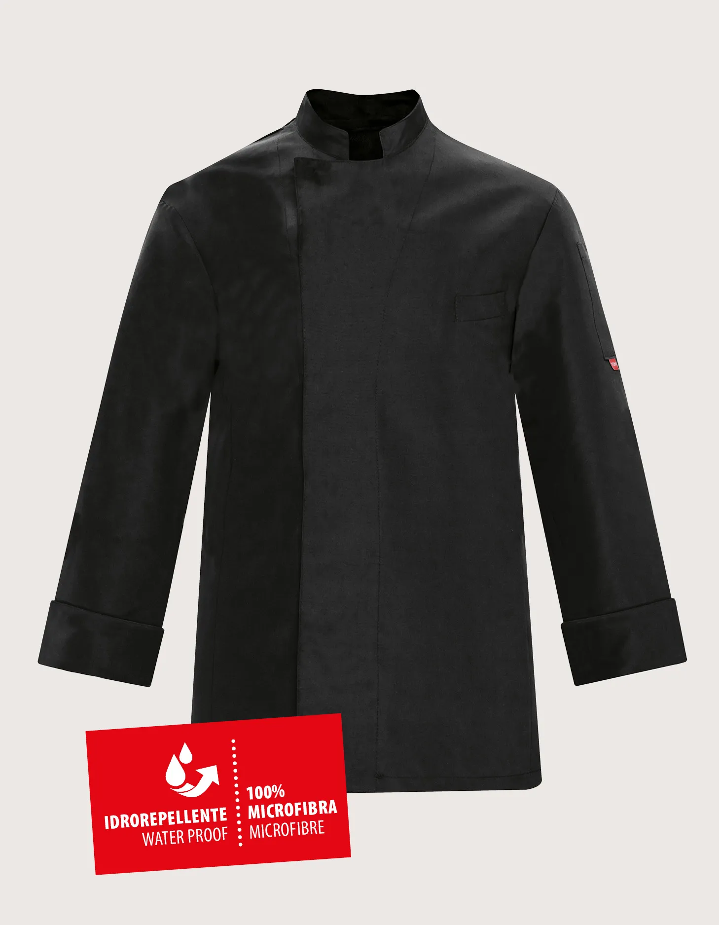 Unisex chef jackets, long sleeves. Available colors: white and black. Features: 100% microfiber fabric, water-repellent and stain-resistant; ventilation mesh on the back; chest pocket and left sleeve pocket. Closure: side fastening with covered press studs, not in contact with the skin. Available sizes: from XS to XXXL. Washable up to 50°C. 100% Made in Italy. Suitable as a professional uniform for kitchens, pastry shops, gastronomy, and food laboratories.