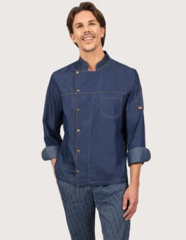 100 Grams Unisex Chef Jacket, long sleeves in denim, very light and comfortable. Features: 100% cotton fabric; small pocket on the left sleeve. Closure: side fastening with covered press studs, not in contact with the skin. Available sizes: from XS to XXXL. Washable up to 40°C. 100% Made in Italy. Suitable as a professional uniform for kitchens, pastry shops, gastronomy, and food laboratories.