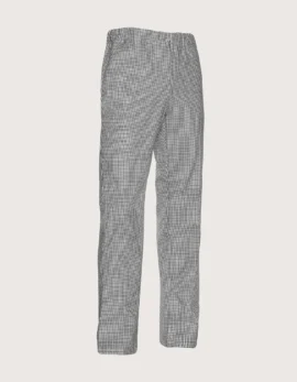 Unisex chef/cook pants in classic “Pied de Poule” pattern, featuring elastic waistband with drawstring closure. Features: 100% cotton fabric; three pockets including two side pockets and one back pocket. Comfort fit. Sizes available from XS to XXXL. Machine washable up to 60°C. 100% Made in Italy. Ideal as part of the uniform for kitchens, pastry shops, gastronomy, and food laboratories.