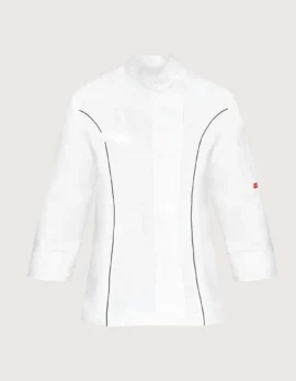 Frida women’s chef jacket in white cotton with long sleeves. Features: 100% cotton; pocket on the chest and left sleeve. Closure: side snap buttons, covered – not in contact with the skin. Available sizes: XS to XXL. Washable up to 60°C. 100% Made in Italy. Suitable as professional attire for kitchens, pastry, gastronomy, and food laboratories. Also available in black.