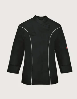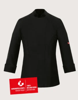 Frida women’s chef jacket in black cotton with long sleeves. Features: 100% cotton; pocket on the chest and left sleeve. Closure: side snap buttons, covered – not in contact with the skin. Available sizes: XS to XXL. Washable up to 60°C. 100% Made in Italy. Suitable as professional attire for kitchens, pastry, gastronomy, and food laboratories. Also available in white.