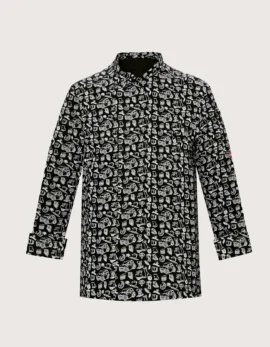 Gordon unisex chef/cook jacket, long sleeve in the “Skull” print, made of 100% cotton with ventilation on the back; pocket on the chest and left sleeve. Closure: side with covered snap buttons, not in contact with the skin. Sizes available: XS to XXXL. Washable up to 60°C (excellent color retention). Can be coordinated with various aprons, with or without bib, pants, and hats in the same print. Professional kitchen wear. Product by Toma Youniform, 100% Made in Italy. Also available in Italy and Superheroes prints.
