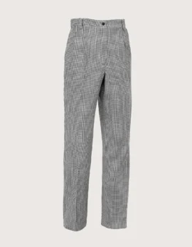 Unisex chef/cook pants in “Pied de Poule” pattern. Features: equipped with belt loops and zipper closure; 100% cotton fabric for freshness and hygiene; three pockets including two side pockets and one back pocket. Comfort fit. Sizes available from XS to XXXL. Durable and machine washable up to 60°C. 100% Made in Italy. Perfect as part of the uniform for kitchens, pastry shops, gastronomy, and food laboratories.