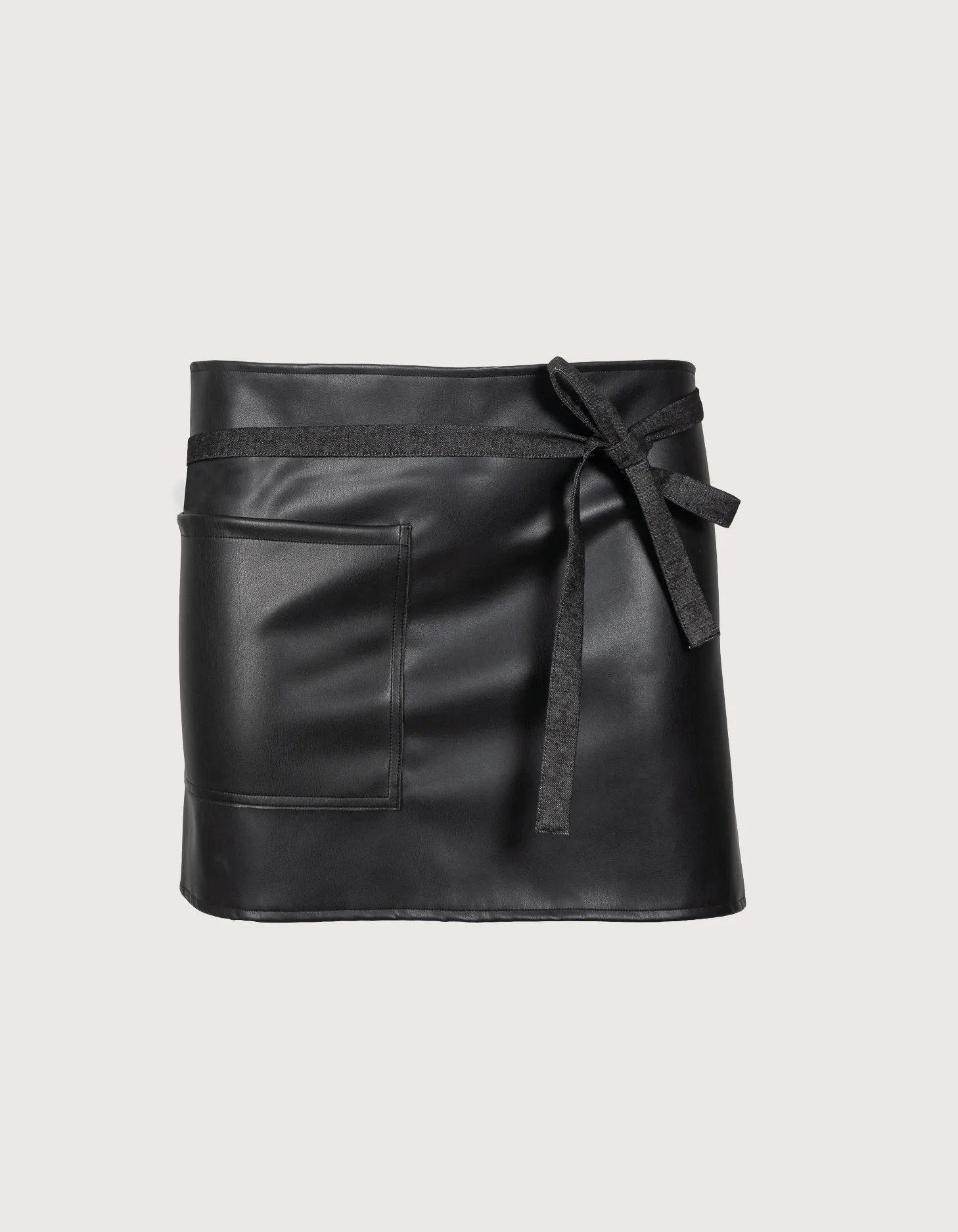 Grembiule corto unisex in ecopelle nero, ideale per addetti al servizio di sala e bar. Tessuto: 100% ecopelle, materiale di alta qualità e sostenibilità. Caratteristiche: chiusura posteriore e/o anteriore con lacci in denim nero. Tasca: una lato destro. Taglia unica, regolabile. Dimensioni: 90 x 75 cm. Lavaggio garantito fino a 40 gradi. Prodotto 100% Made in Italy.