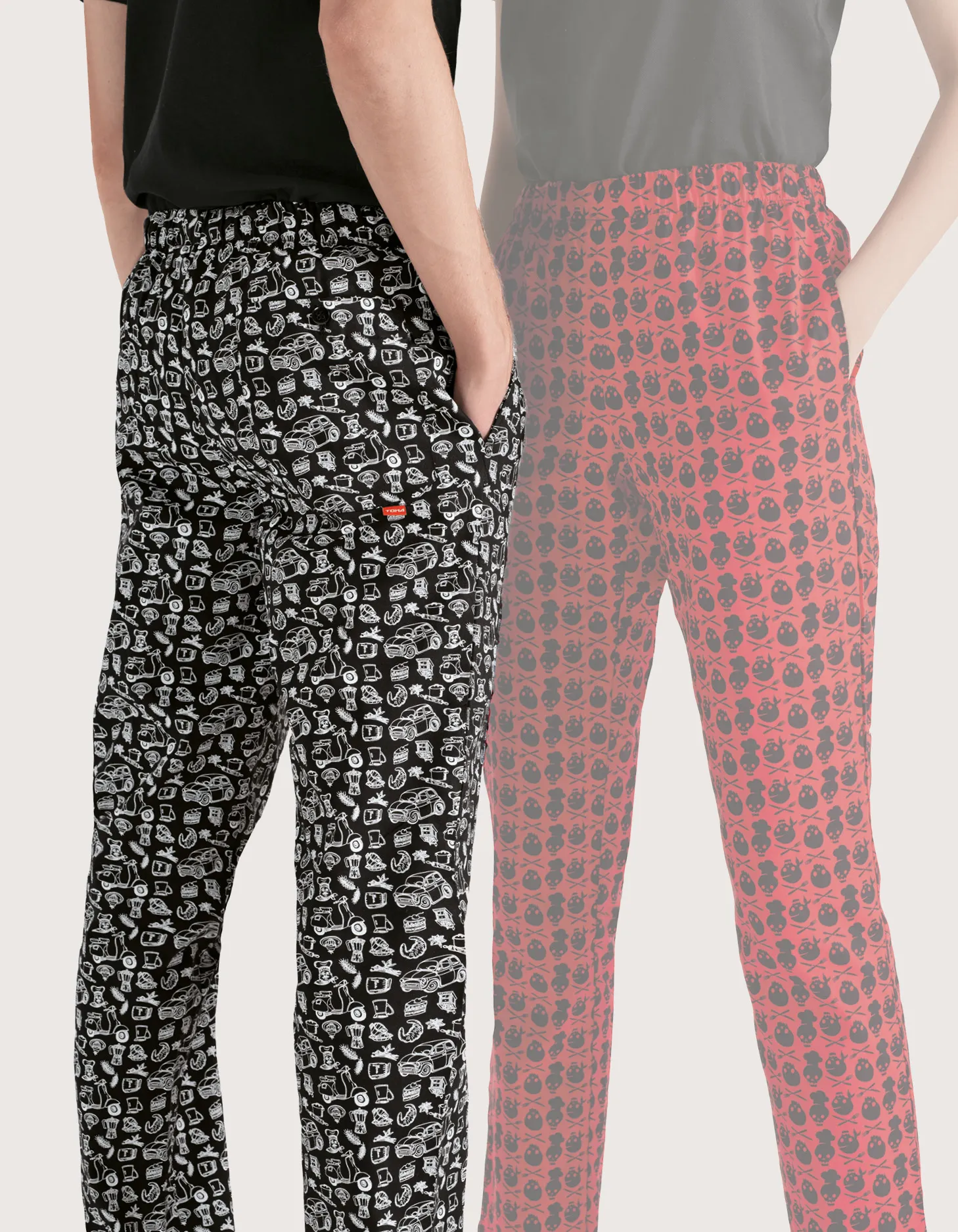 Pantaloni unisex da chef/cuoco, con elastico in vita e chiusura a coulisse. Colori disponibili: nero con la simpatica fantasia in bianco “Italia” e rosso con la fantasia in nero “Teschio”. Caratteristiche: tessuto 100% cotone; tasche tre di cui due laterali e una posteriore.Vestibilità comfort. Taglie disponibili dalla XS alla XXXL. Lavaggio garantito fino a 60 gradi. Prodotto 100% Made in Italy. Possono far parte della divisa da servizio in cucina, pasticceria, gastronomia e laboratori alimentari.