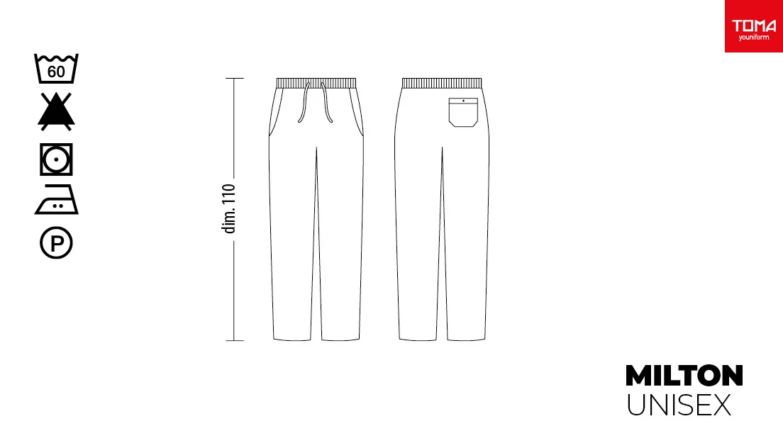 Pantaloni unisex chef/cuoco con elastico in vita e chiusura a coulisse, disponibili nelle fantasie “Cucina” e “Black & White”. Caratteristiche: tessuto 100% cotone che garantisce freschezza e comodità, due tasche laterali e una tasca posteriore. Taglie disponibili dalla XS alla XXX. Estremamente resistenti mantengono forma e colore anche dopo numerosi lavaggi a 60 gradi. Vestibilità comfort.