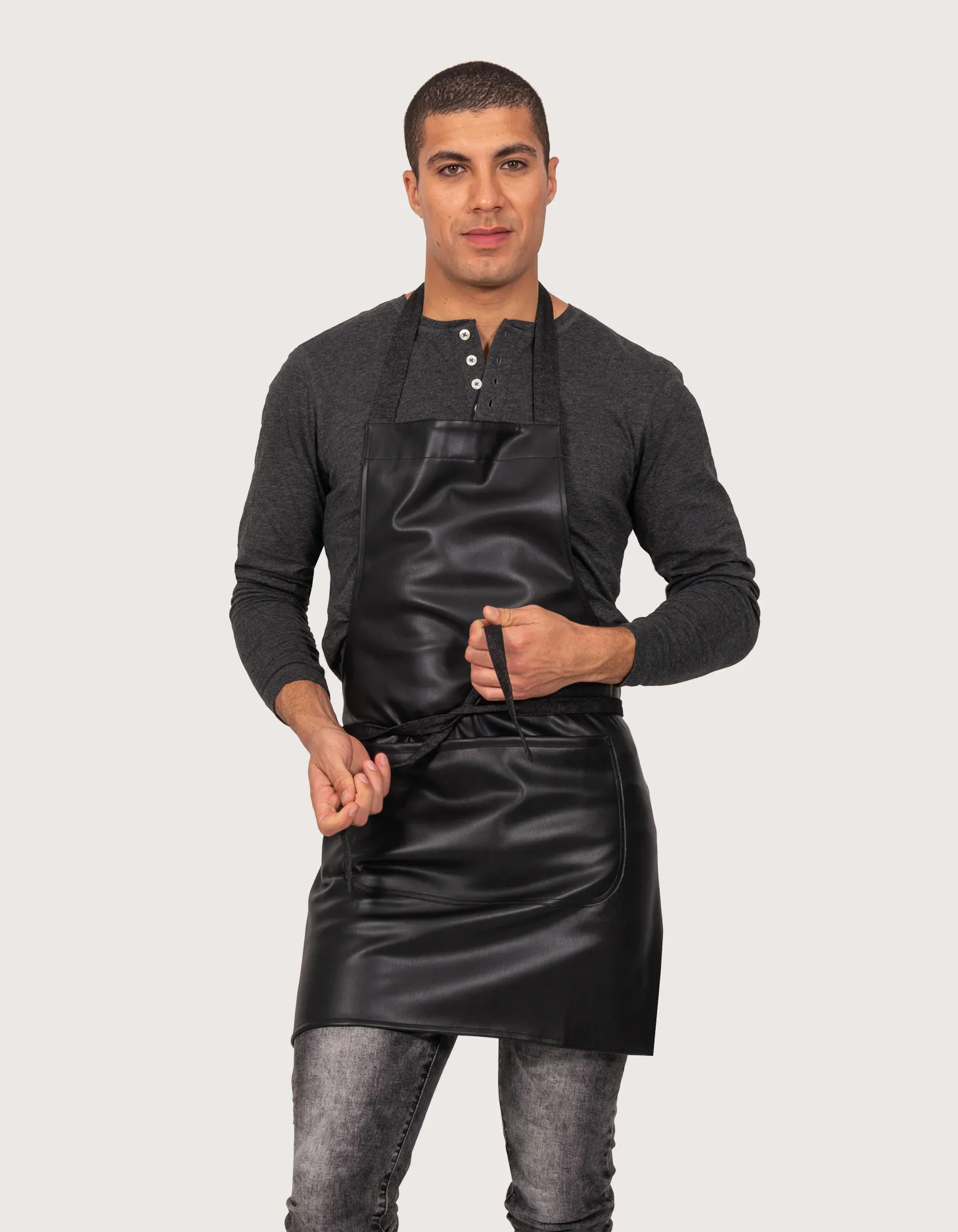 Grembiule con pettorina unisex in ecopelle nera, ideale per addetti al servizio di sala e bar. Tessuto: 100% ecopelle, materiale di alta qualità e sostenibilità. Caratteristiche: con pettorina, collo regolabile con velcro, chiusura posteriore e/o anteriore con lacci in denim nero. Tasca: una centrale. Taglia unica, regolabile. Dimensioni: 70 x 75 cm (larghezza x altezza) + collo. Lavaggio garantito fino a 40 gradi. Prodotto 100% Made in Italy.
